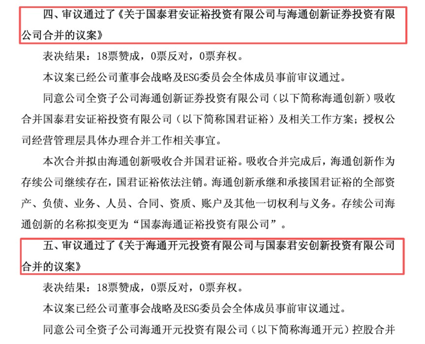 公告显示,海通创新将吸收合并国君证裕,吸收合并完成后,海通创新承继和承接国君证裕的全部资产、负债、业务、人员、合同、资质、账户及其他一切权利与义务,名称拟变更为“国泰海通证裕投资有限公司”。