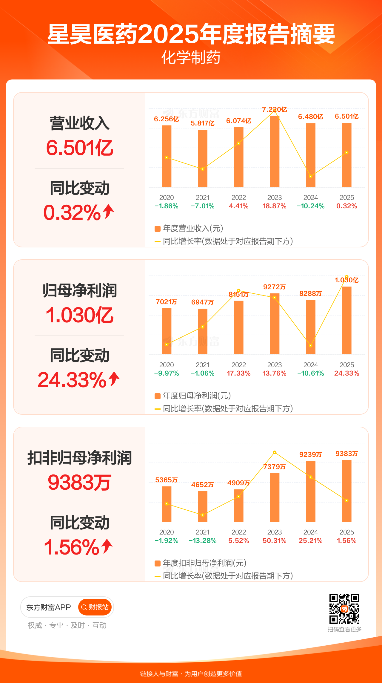 星昊医药4月24日发布2025年年报显示,公司全年实现营业收入6.50亿元,同比增长0.32%;归母净利润1.03亿元,同比增长24.33%;扣非归母净利润9383.28万元,同比增长1.56%。