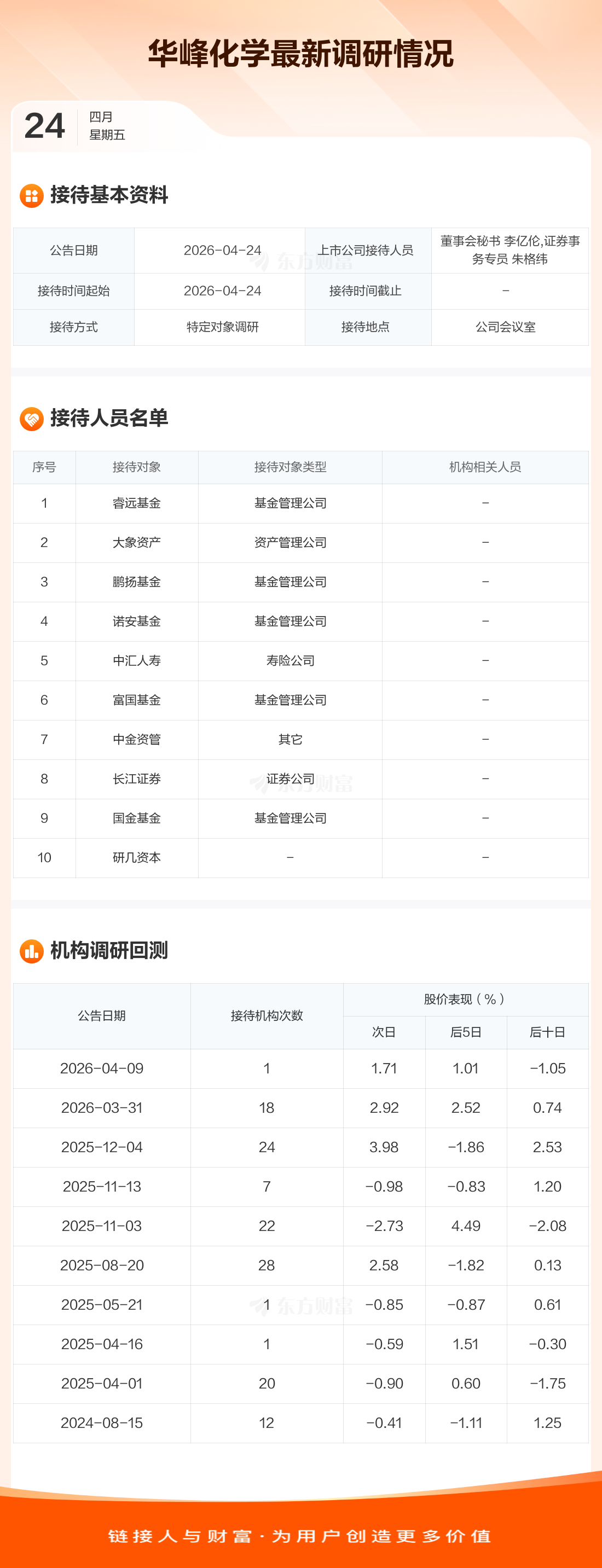 华峰化学4月24日公告称,4月24日接待睿远基金等10家机构调研。接待人员包括董事会秘书 李亿伦,证券事务专员 朱格纬。