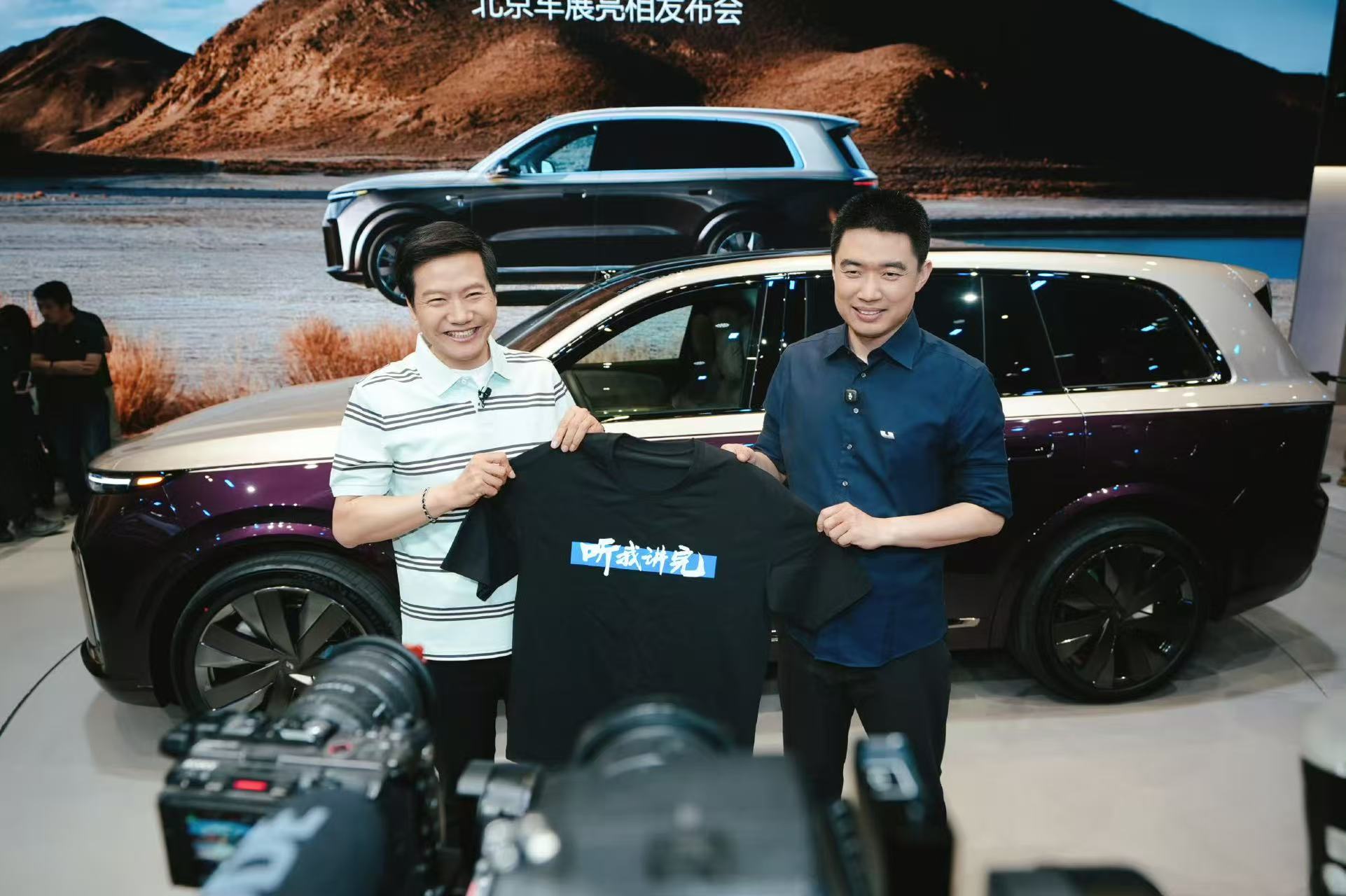 不过雷军“自有安排”。车展首日下午,雷军逛车展的“保留节目”开始上演。在理想展台串门时,他给理想汽车CEO李想带了件定制T恤,上面印着李想的出圈语录“听我讲完”,贡献了今年车展的名场面。随后,雷军也给李斌、何小鹏送上了他们各自的“经典语录T恤”。