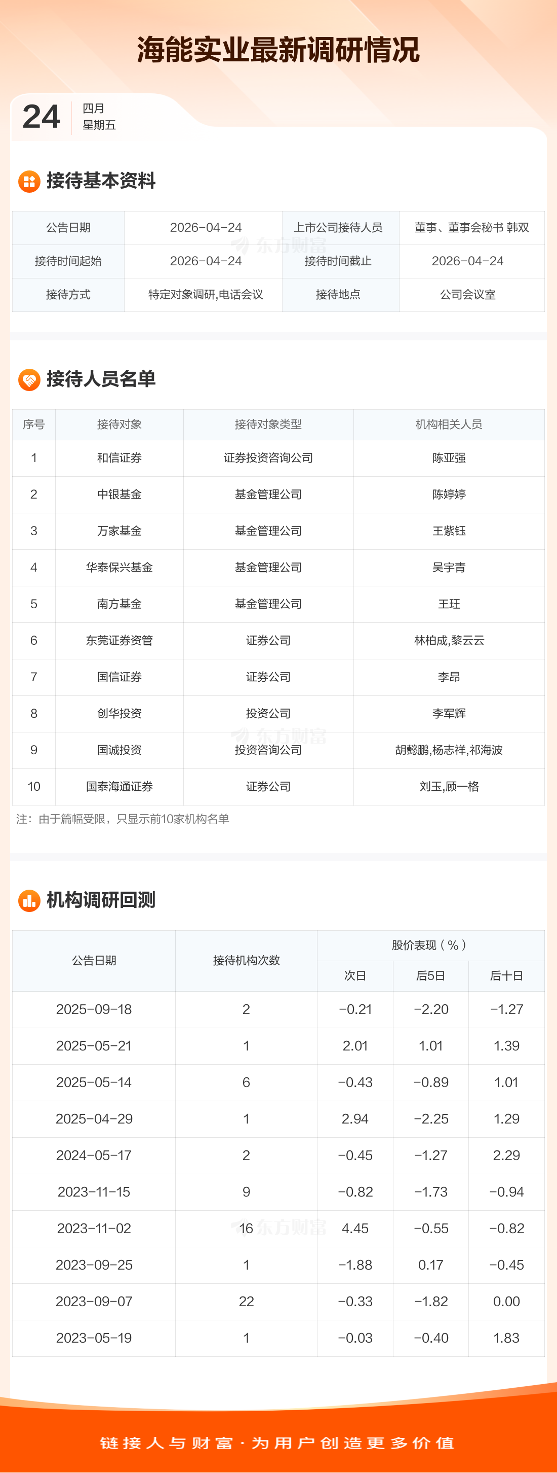 海能实业4月24日公告称,4月24日接待和信证券等14家机构调研。接待人员包括董事、董事会秘书 韩双。