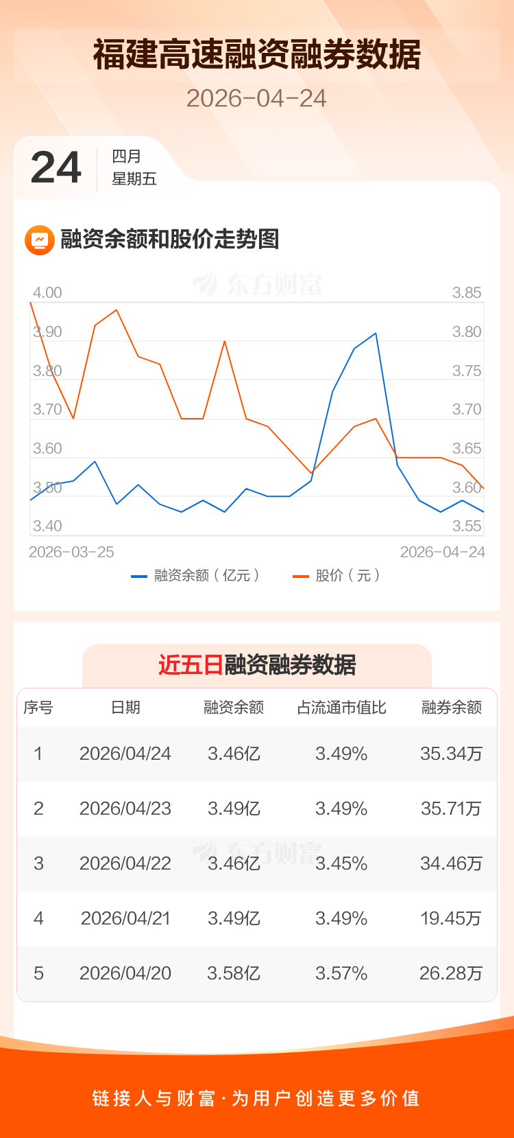 交易所最新数据显示,福建高速于2026年4月24日获融资买入688.64万元,融资偿还1024.79万元,当日融资净偿还336.15万元。目前,该股融资余额3.46亿,占流通市值比例为3.49%。