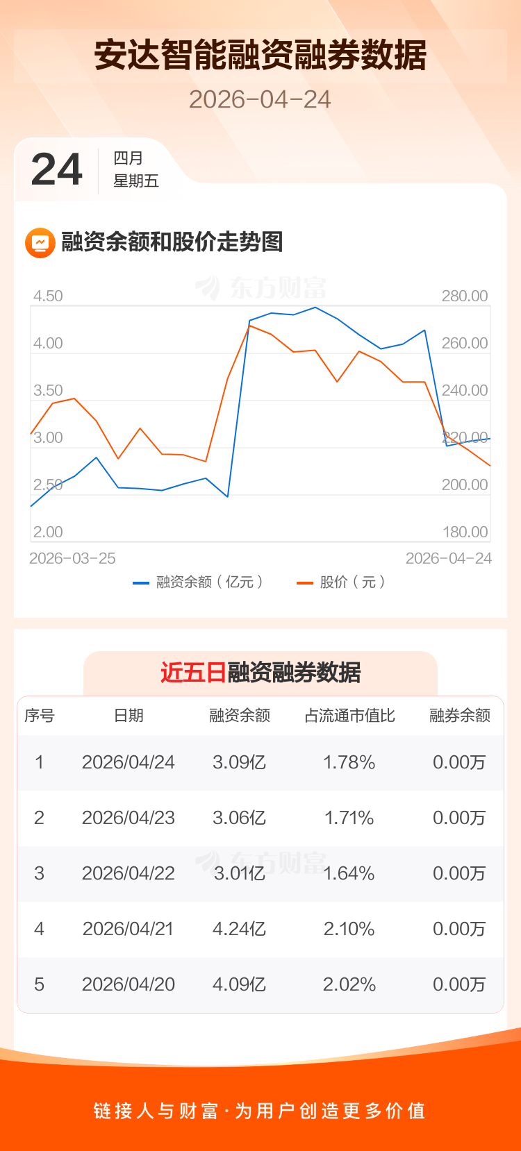 交易所最新数据显示,安达智能于2026年4月24日获融资买入2070.05万元,融资偿还1775.56万元,当日融资净买入294.48万元。目前,该股融资余额3.09亿,占流通市值比例为1.78%。