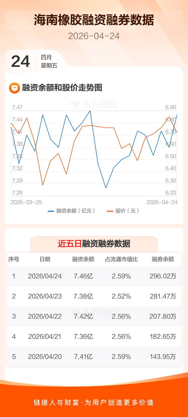 交易所最新数据显示,海南橡胶于2026年4月24日获融资买入2736.61万元,融资偿还2031.20万元,当日融资净买入705.42万元。目前,该股融资余额7.46亿,占流通市值比例为2.59%。