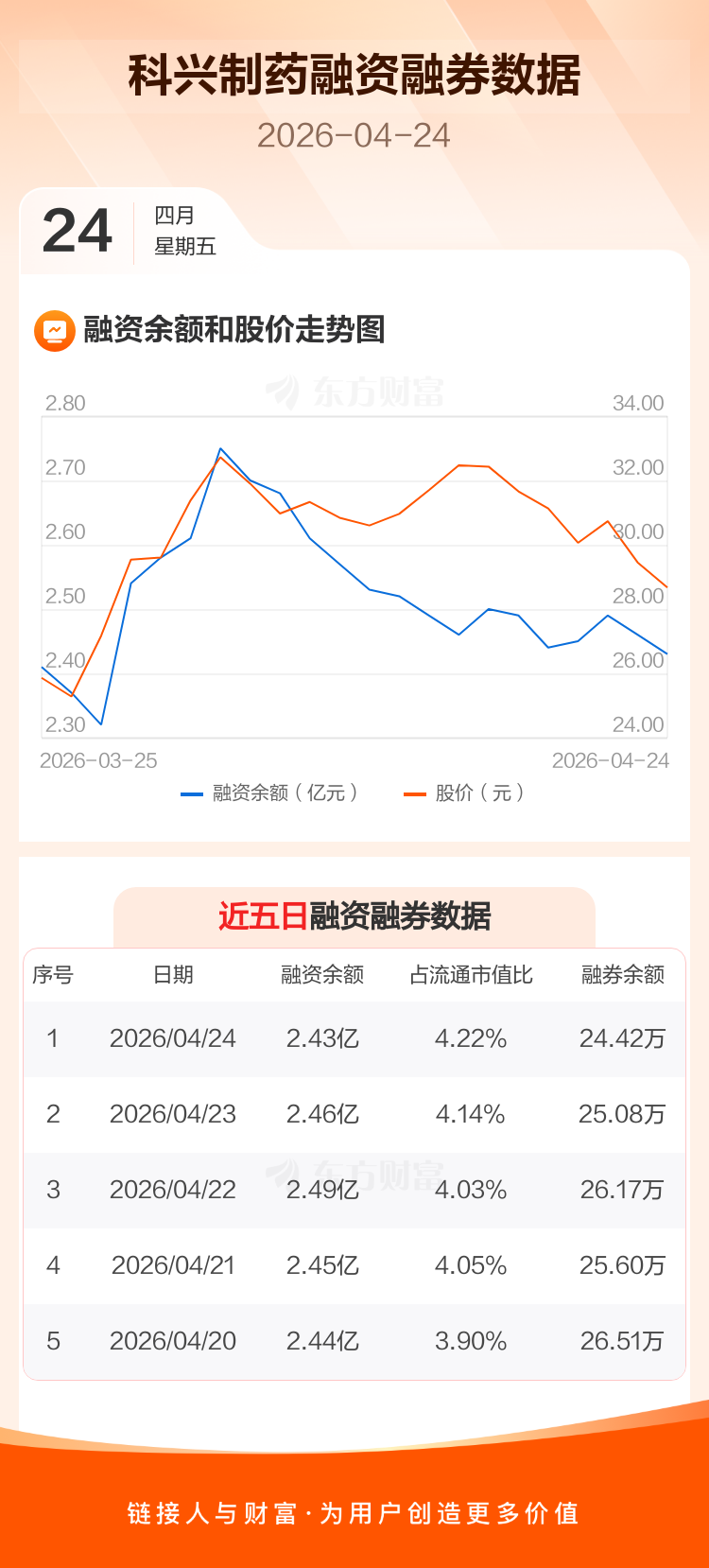 交易所最新数据显示,科兴制药于2026年4月24日获融资买入854.27万元,融资偿还1074.21万元,当日融资净偿还219.94万元。目前,该股融资余额2.43亿,占流通市值比例为4.22%。