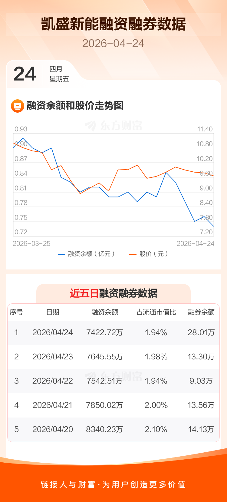 交易所最新数据显示,凯盛新能于2026年4月24日获融资买入213.74万元,融资偿还436.57万元,当日融资净偿还222.83万元。目前,该股融资余额7422.72万,占流通市值比例为1.94%。