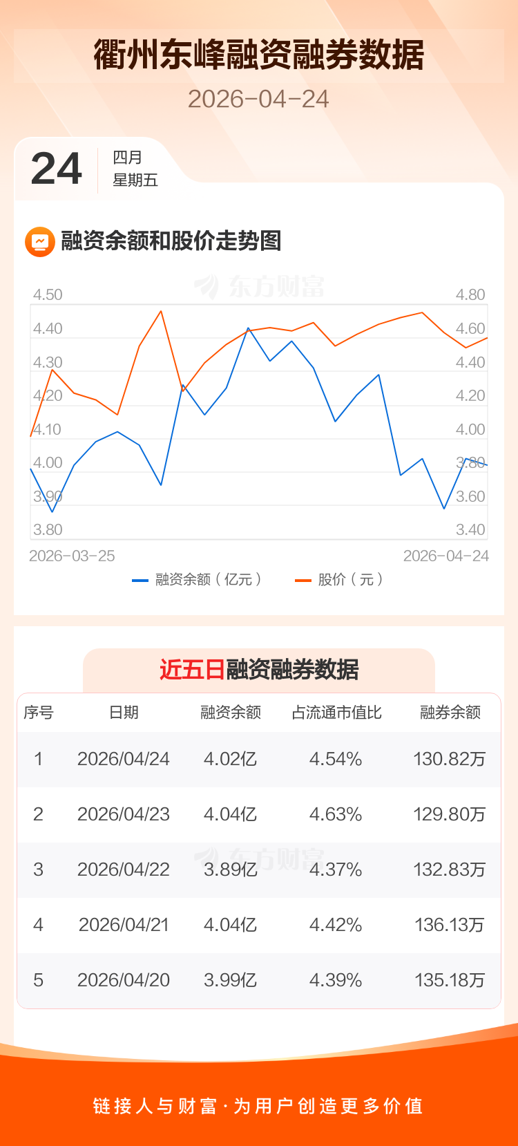 交易所最新数据显示,衢州东峰于2026年4月24日获融资买入1331.86万元,融资偿还1559.59万元,当日融资净偿还227.74万元。目前,该股融资余额4.02亿,占流通市值比例为4.54%。