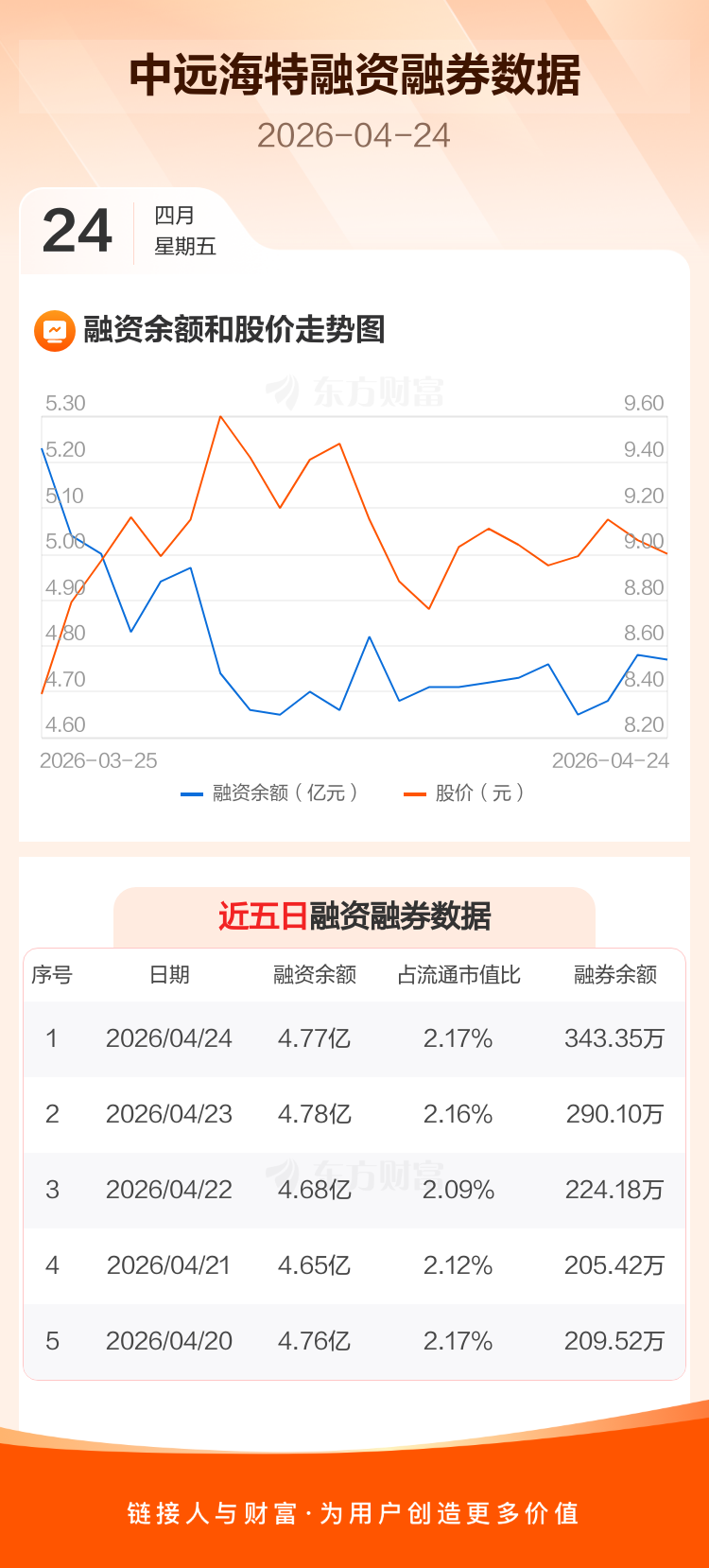交易所最新数据显示,中远海特于2026年4月24日获融资买入2367.69万元,融资偿还2496.34万元,当日融资净偿还128.64万元。目前,该股融资余额4.77亿,占流通市值比例为2.17%。
