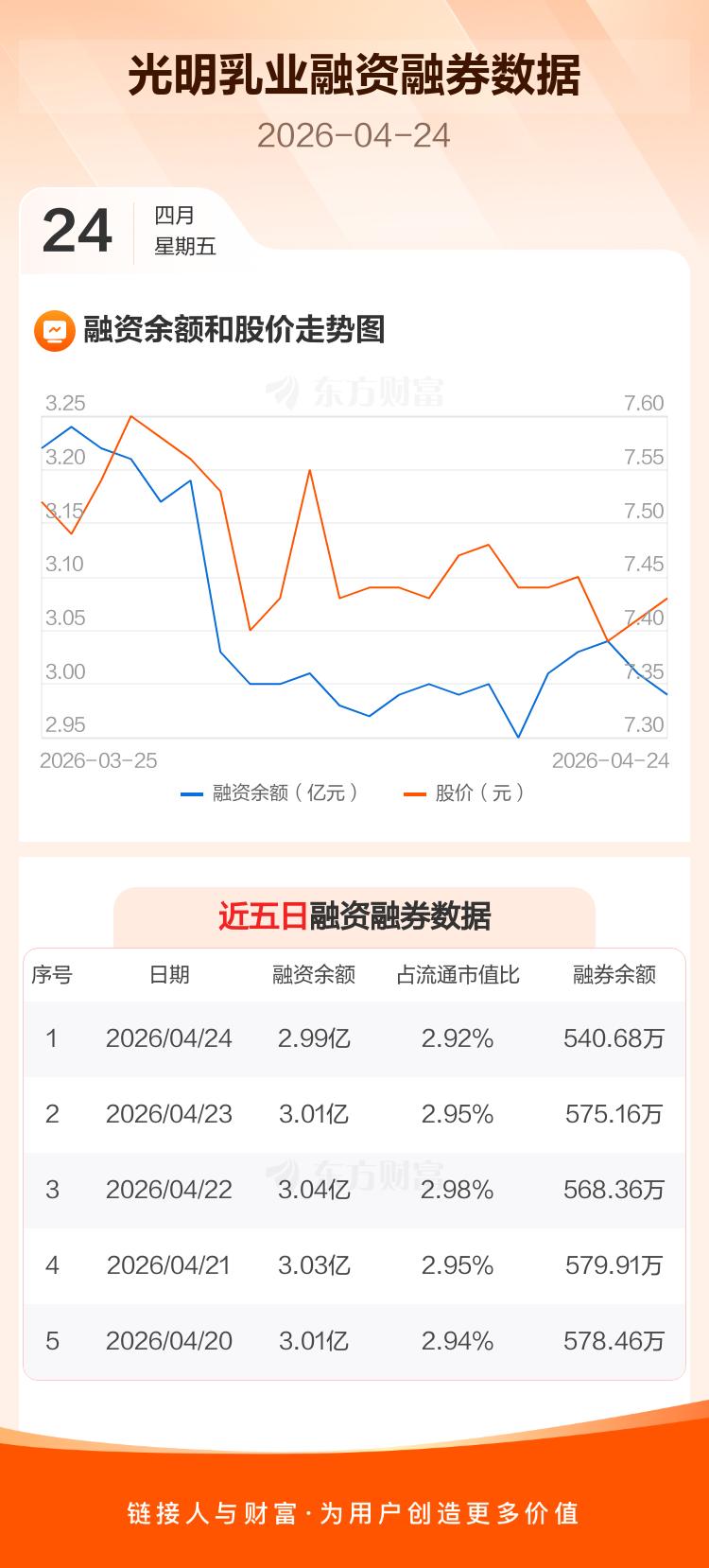 交易所最新数据显示,光明乳业于2026年4月24日获融资买入168.70万元,融资偿还361.19万元,当日融资净偿还192.49万元。目前,该股融资余额2.99亿,占流通市值比例为2.92%。