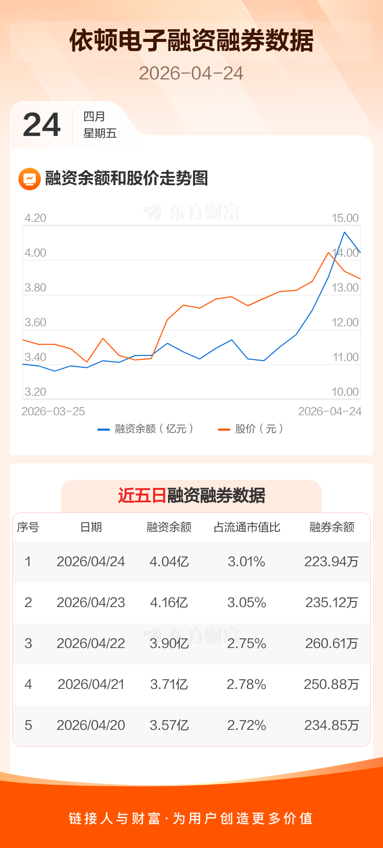 交易所最新数据显示,依顿电子于2026年4月24日获融资买入3910.89万元,融资偿还5197.80万元,当日融资净偿还1286.91万元。目前,该股融资余额4.04亿,占流通市值比例为3.01%。