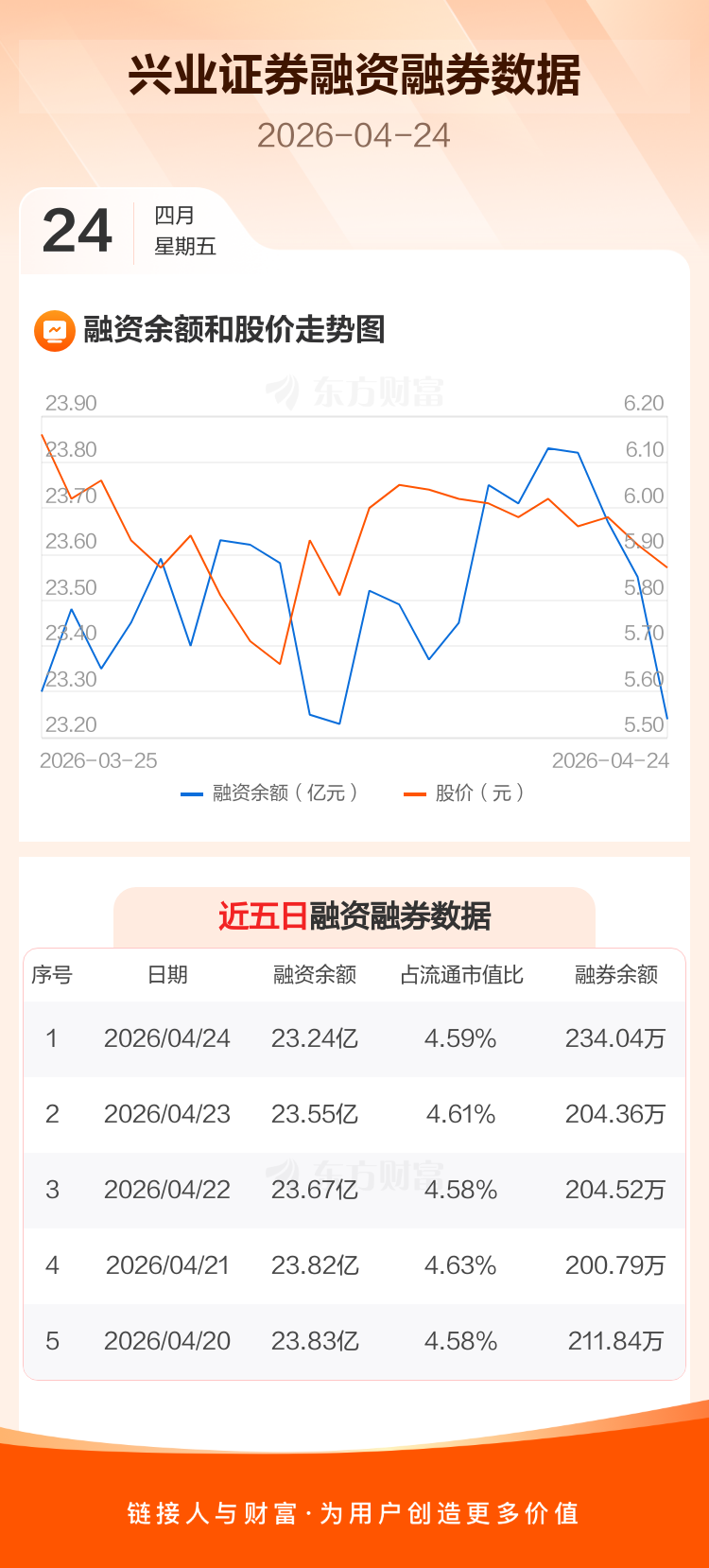 交易所最新数据显示,兴业证券于2026年4月24日获融资买入4469.02万元,融资偿还7521.72万元,当日融资净偿还3052.7万元。目前,该股融资余额23.24亿,占流通市值比例为4.59%。