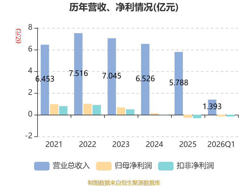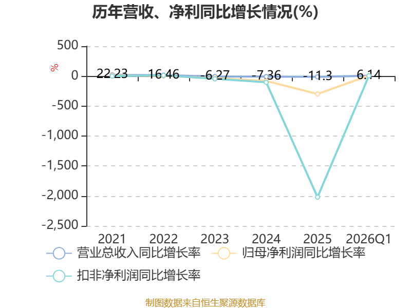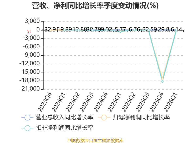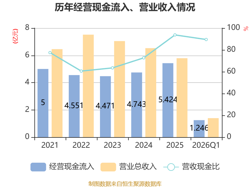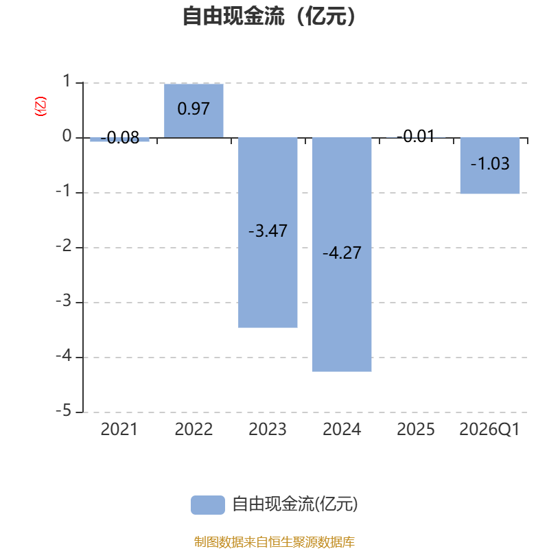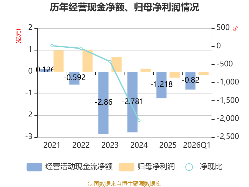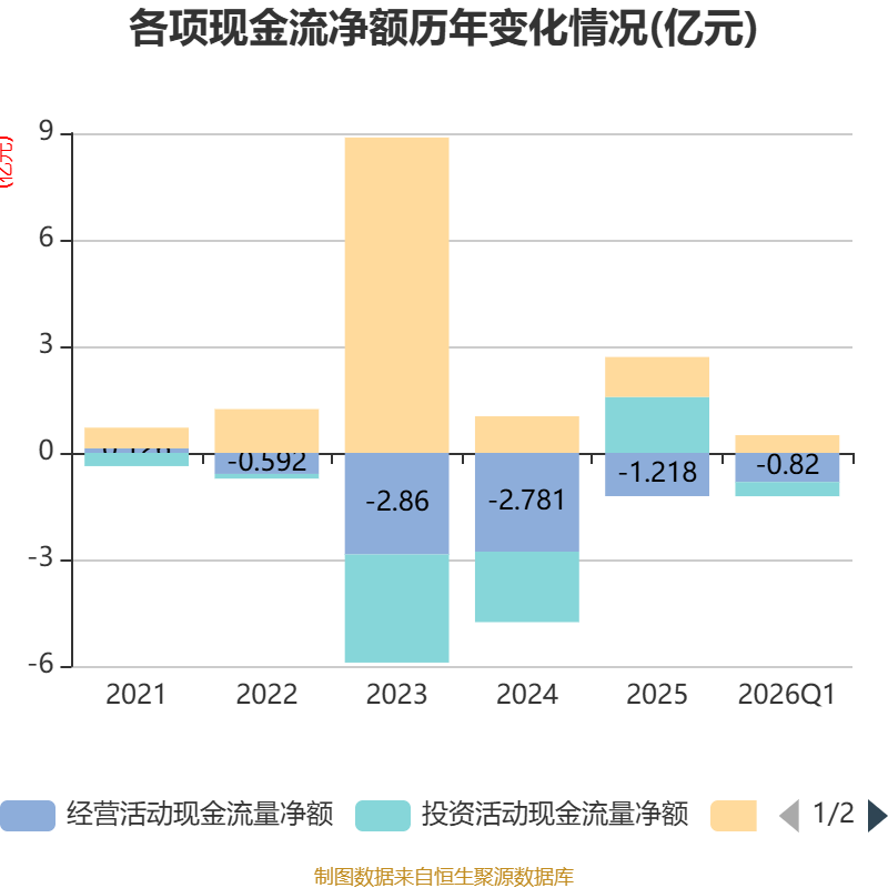 截至2026年一季度末,公司经营活动现金流净额为-8197.35万元,同比增加9131.99万元;筹资活动现金流净额4990.49万元,同比减少2309.73万元;投资活动现金流净额-4013.77万元,上年同期为8656.08万元。