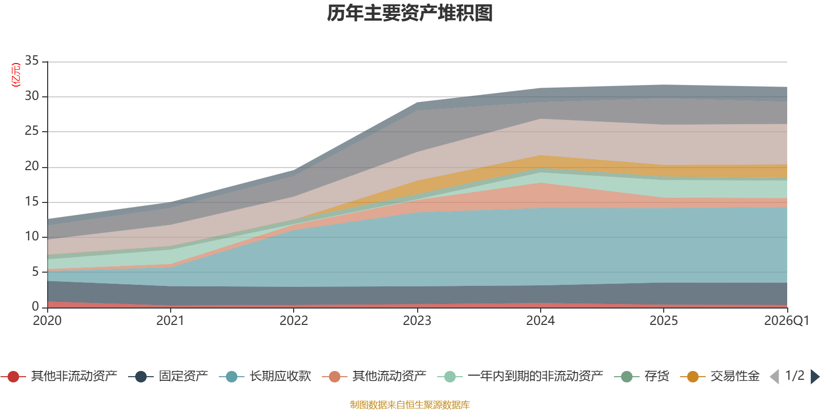 资产重大变化方面,截至2026年一季度末,公司货币资金较上年末减少15.32%,占公司总资产比重下降1.7个百分点;交易性金融资产合计较上年末增加15.95%,占公司总资产比重上升0.89个百分点;长期应收款较上年末增加1.44%,占公司总资产比重上升0.84个百分点;其他流动资产较上年末减少13.52%,占公司总资产比重下降0.6个百分点。