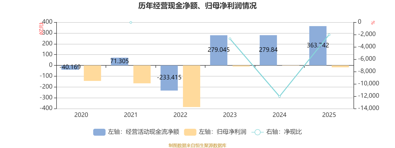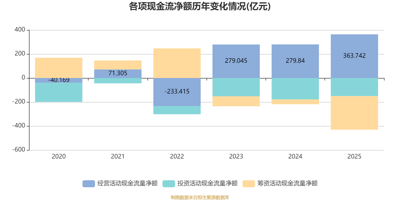 2025年,公司经营活动现金流净额为363.74亿元,同比增长29.98%;筹资活动现金流净额-279.8亿元,同比减少239.84亿元;投资活动现金流净额-150.82亿元,上年同期为-178.63亿元。