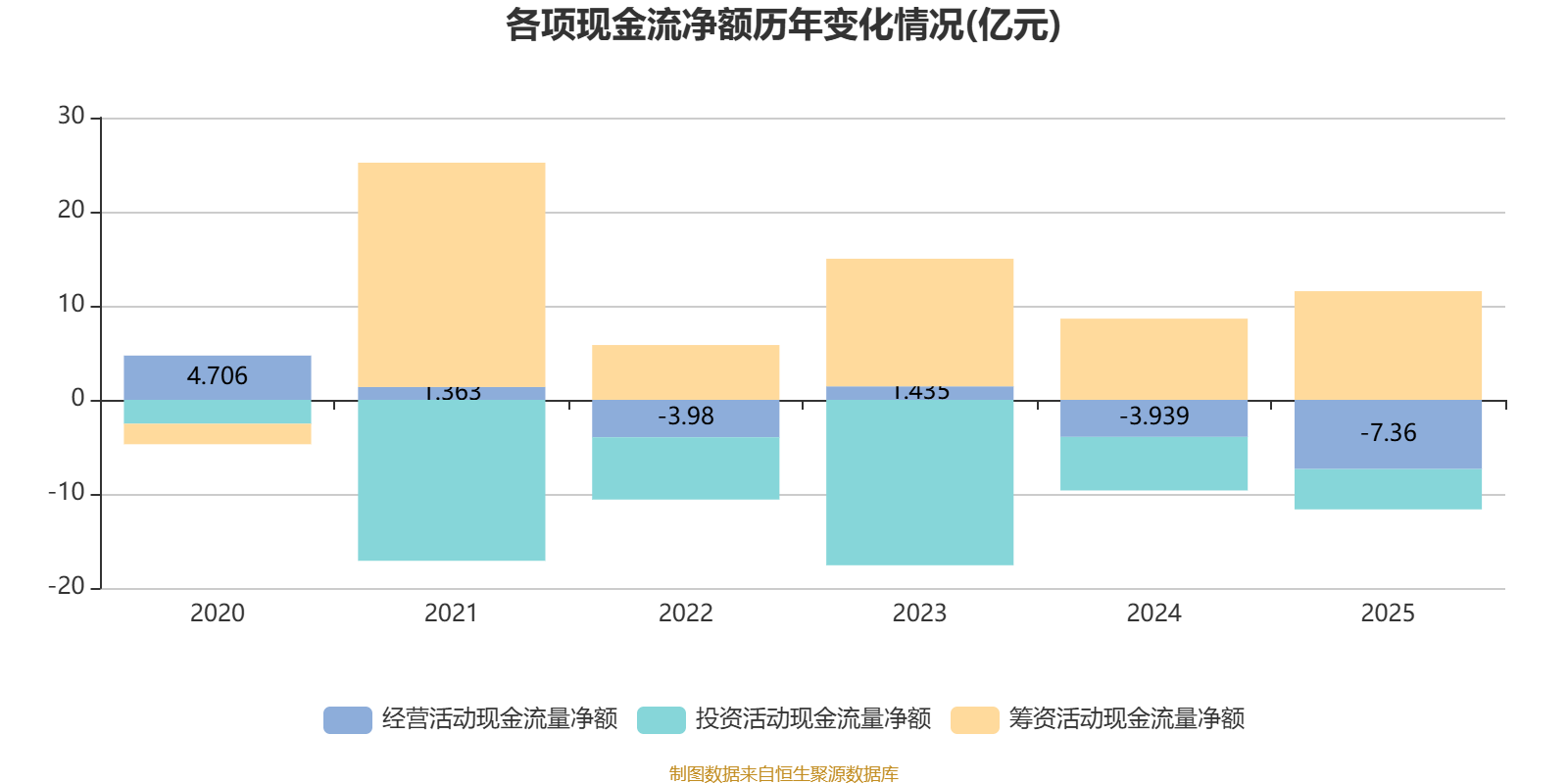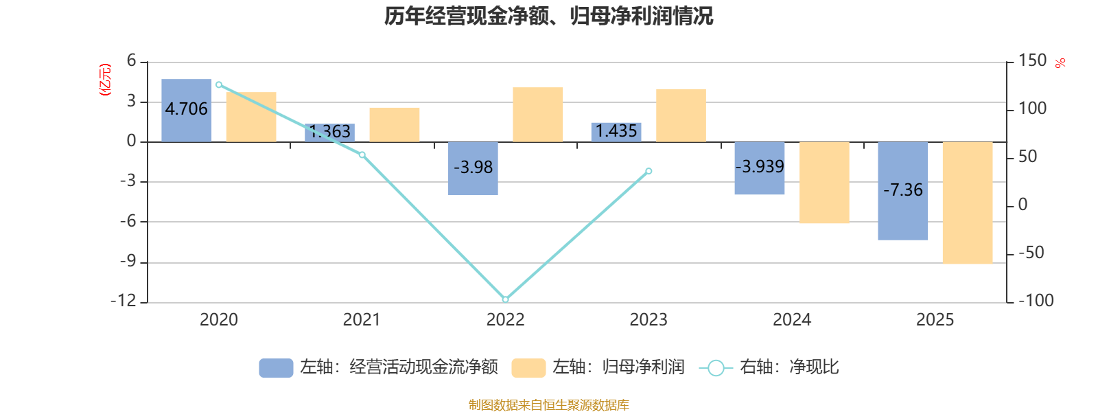 2025年,公司经营活动现金流净额为-7.36亿元,同比减少3.42亿元;筹资活动现金流净额11.55亿元,同比增加2.92亿元;投资活动现金流净额-4.28亿元,上年同期为-5.69亿元。
