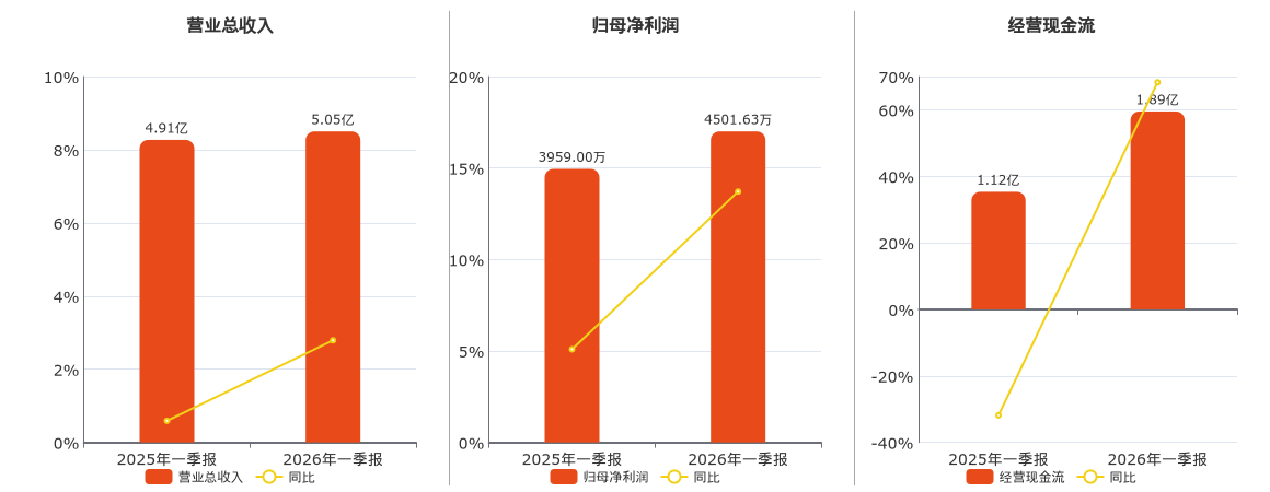 公司营业总收入为5.05亿元。归母净利润为4501.63万元。经营活动现金净流入为1.89亿元。