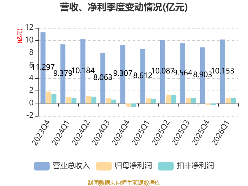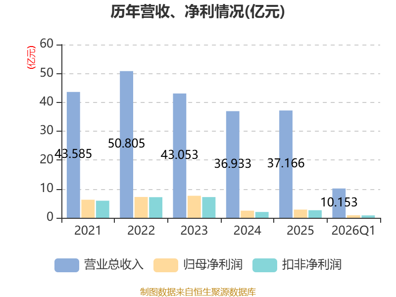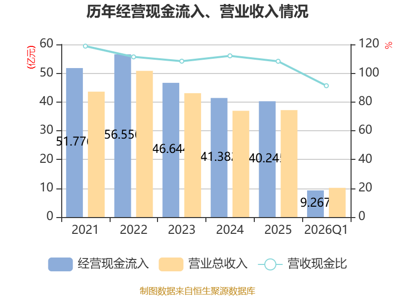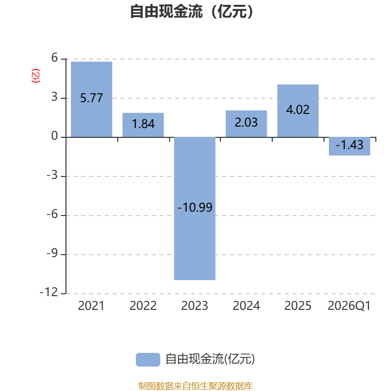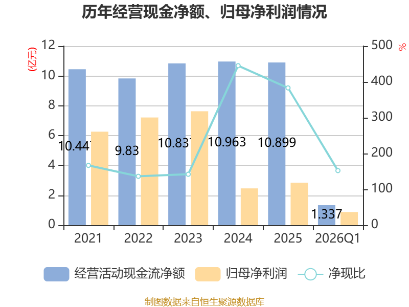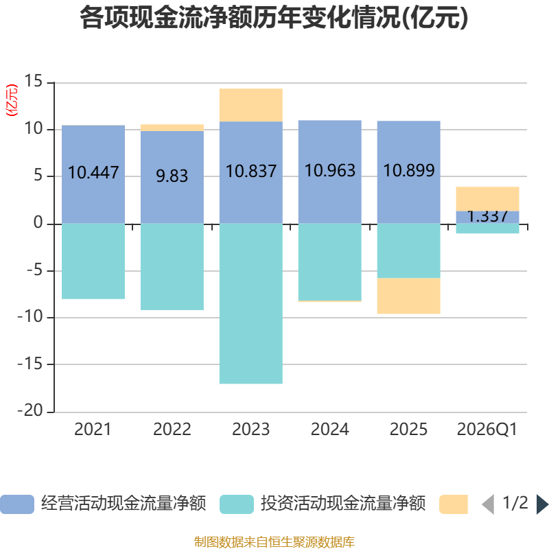 截至2026年一季度末,公司经营活动现金流净额为1.34亿元,同比增长7.01%;筹资活动现金流净额2.56亿元,同比增加1.54亿元;投资活动现金流净额-1.06亿元,上年同期为-3211.85万元。
