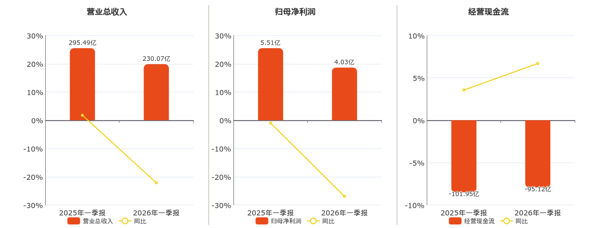 公司营业总收入为230.07亿元,较去年同报告期营业总收入减少65.43亿元,同比较去年同期下降22.14%。归母净利润为4.03亿元,较去年同报告期归母净利润减少1.48亿元,同比较去年同期下降26.93%。经营活动现金净流入为-95.12亿元,较去年同报告期经营活动现金净流入增加6.83亿元,实现3年连续上涨。