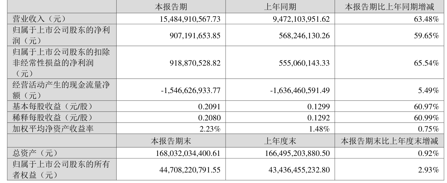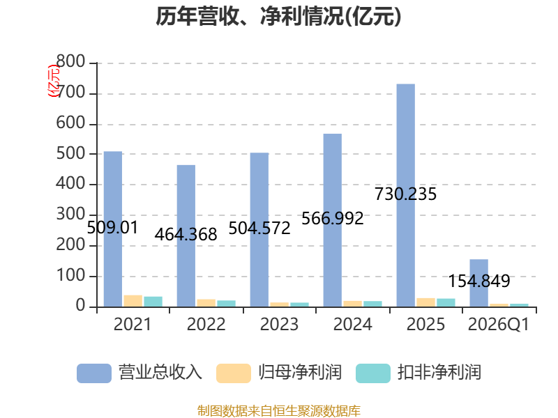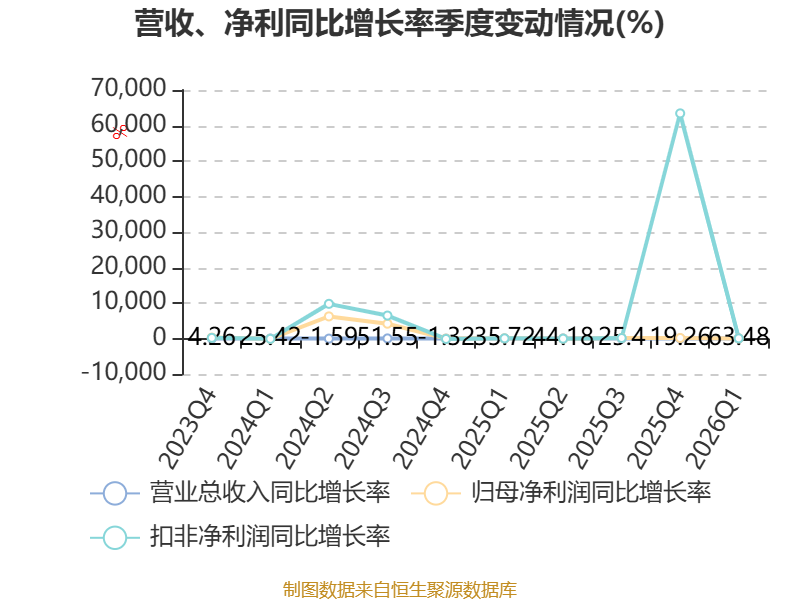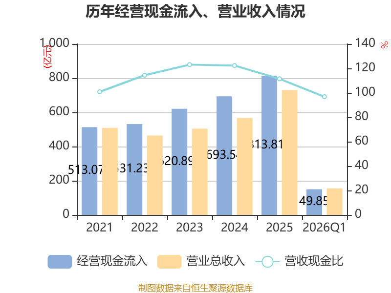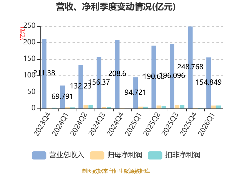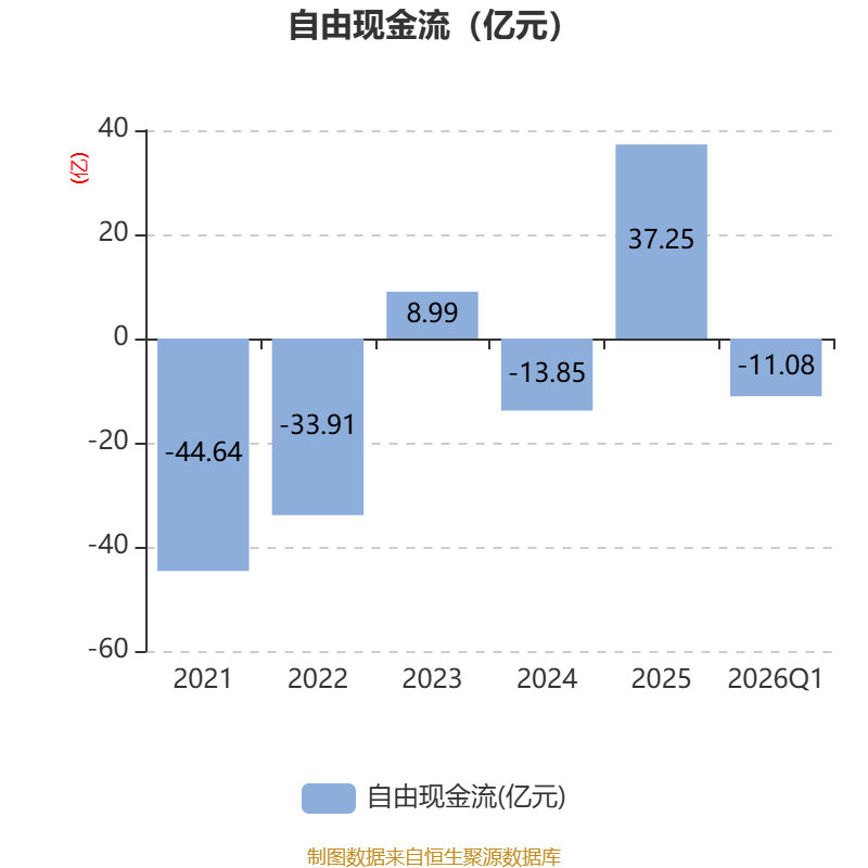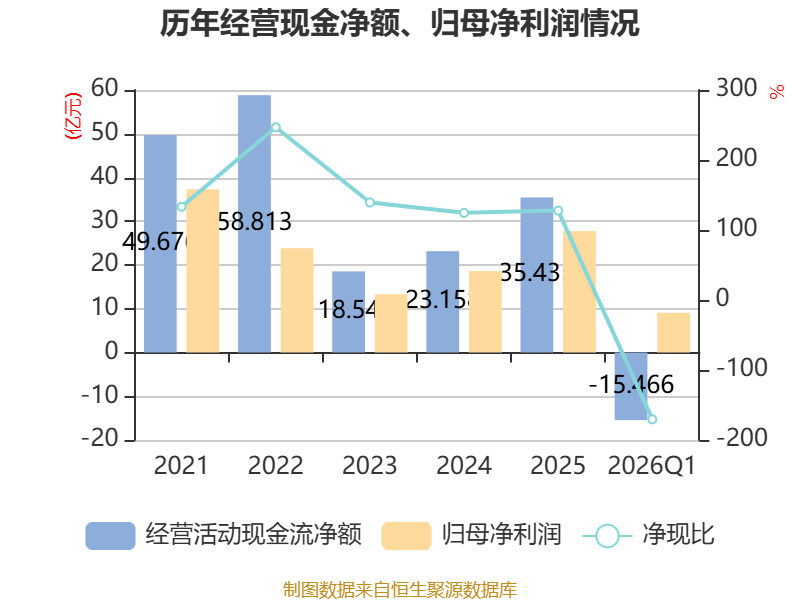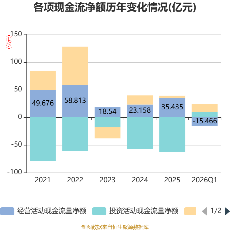 截至2026年一季度末,公司经营活动现金流净额为-15.47亿元,同比增加8983.37万元;筹资活动现金流净额13.91亿元,同比减少19.52亿元;投资活动现金流净额9.82亿元,上年同期为4.32亿元。