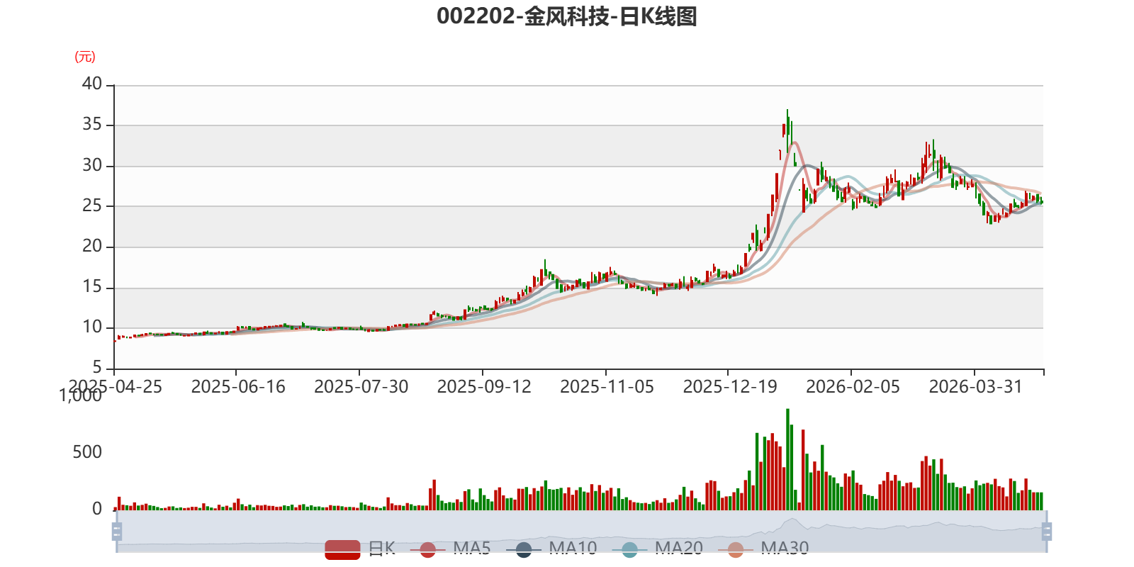 中证智能财讯金风科技(002202)4月25日披露2026年第一季度报告。公司实现营业总收入154.85亿元,同比增长63.48%;归母净利润9.07亿元,同比增长59.65%;扣非净利润9.19亿元,同比增长65.54%;经营活动产生的现金流量净额为-15.47亿元,上年同期为-16.36亿元;报告期内,金风科技基本每股收益为0.2091元,加权平均净资产收益率为2.23%。