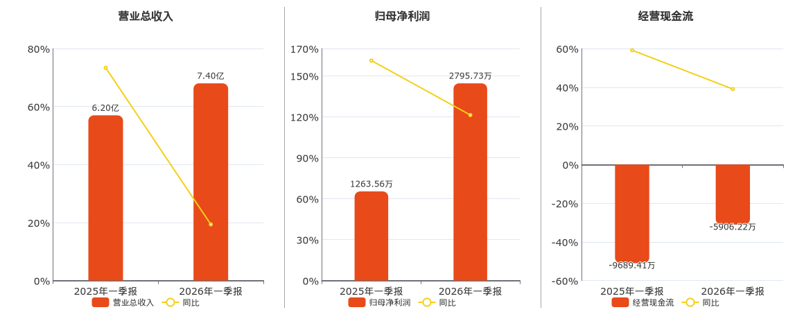 公司营业总收入为7.40亿元。归母净利润为2795.73万元。经营活动现金净流入为-5906.22万元。