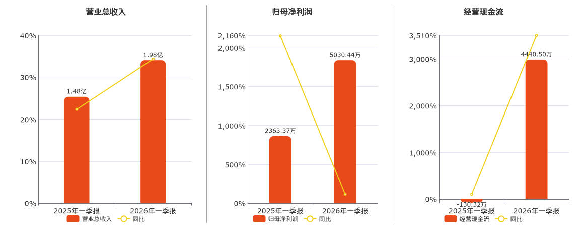 公司营业总收入为1.98亿元。归母净利润为5030.44万元。经营活动现金净流入为4440.50万元。