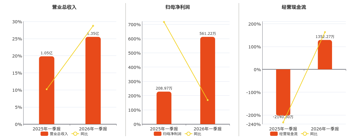 公司营业总收入为1.35亿元。归母净利润为561.22万元。经营活动现金净流入为1352.27万元。