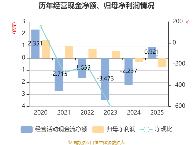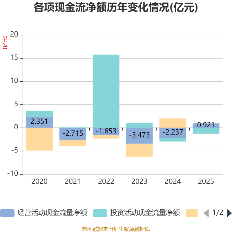 截至2025年,公司经营活动现金流净额为9209.93万元,同比增加3.16亿元;筹资活动现金流净额533.32万元,同比减少1.93亿元;投资活动现金流净额-1.3亿元,上年同期为-7561.22万元。