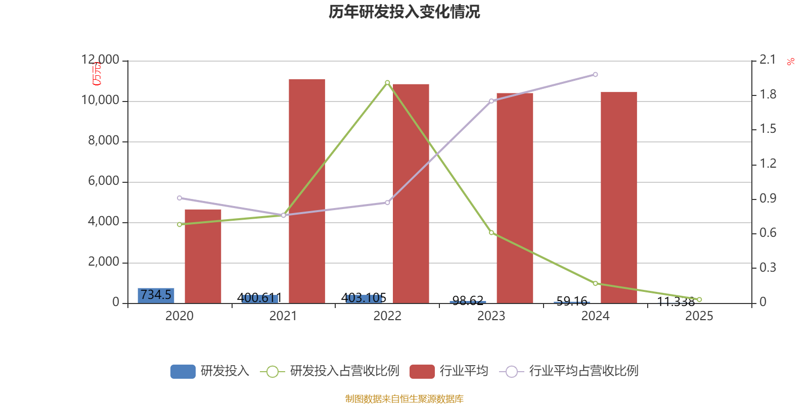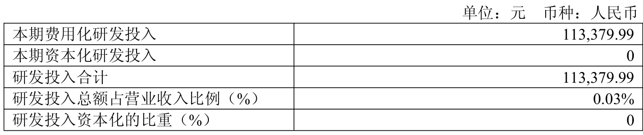 2025年全年,公司研发投入金额为11.34万元,同比下降80.84%;研发投入占营业收入比例为0.03%,相比上年同期下降0.14个百分点。此外,公司全年研发投入资本化率为0%。