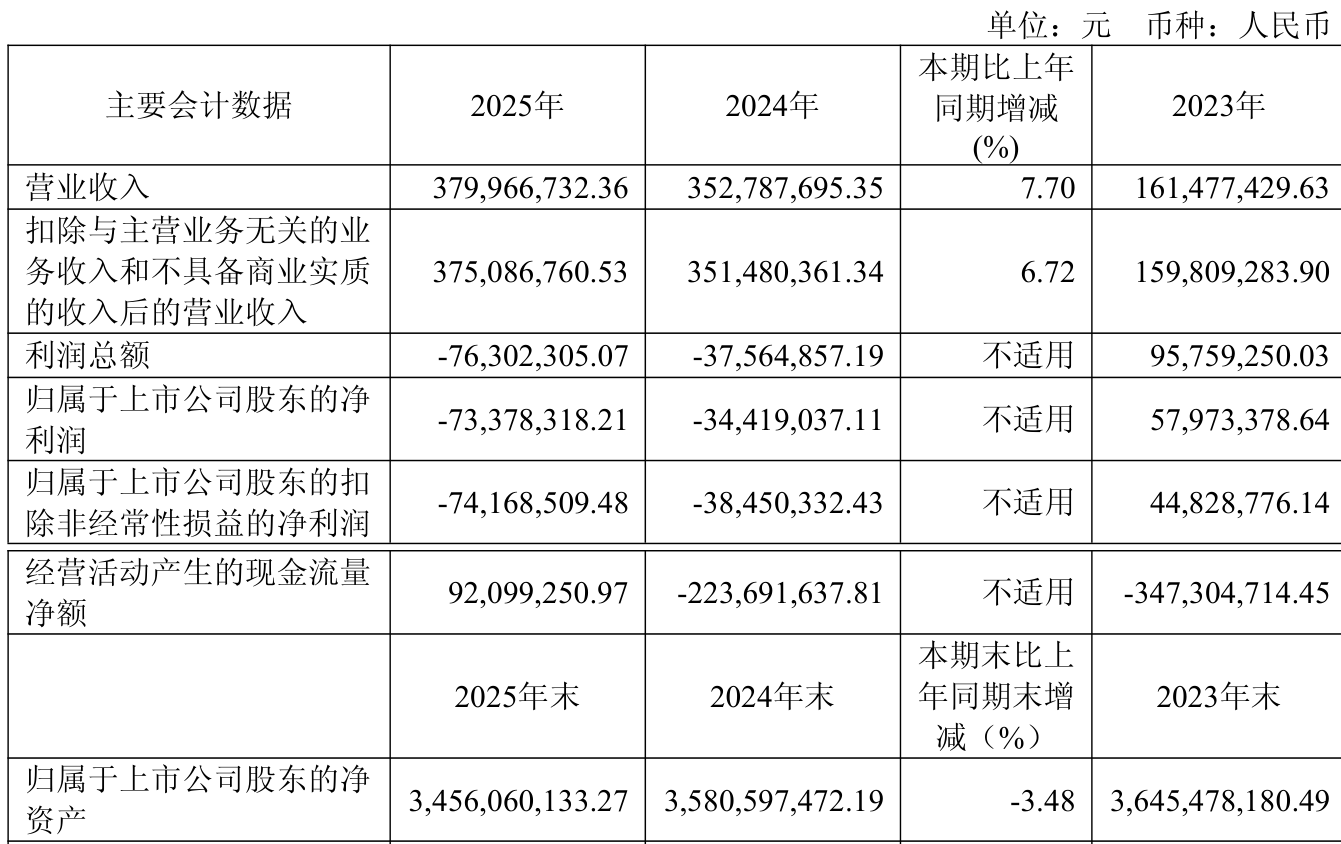 中证智能财讯华丽家族(600503)4月25日披露2025年年度报告。2025年,公司实现营业总收入3.8亿元,同比增长7.70%;归母净利润亏损7337.83万元,上年同期亏损3441.9万元;扣非净利润亏损7416.85万元,上年同期亏损3845.03万元;经营活动产生的现金流量净额为9209.93万元,上年同期为-2.24亿元;报告期内,华丽家族基本每股收益为-0.0458元,加权平均净资产收益率为-2.09%。