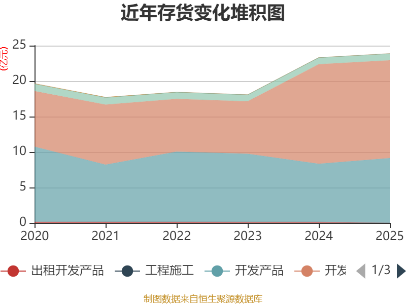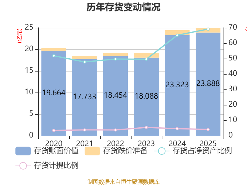 从存货变动来看,截至2025年末,公司存货账面价值为23.89亿元,占净资产的69.12%,较上年末增加5648.7万元。其中,存货跌价准备为1亿元,计提比例为4.04%。