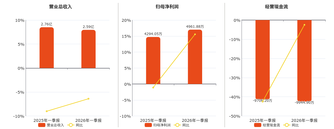 公司营业总收入为2.59亿元,较去年同报告期营业总收入减少1770.21万元,同比较去年同期下降6.40%。归母净利润为4961.88万元。经营活动现金净流入为-9944.90万元,较去年同报告期经营活动现金净流入减少238.70万元。