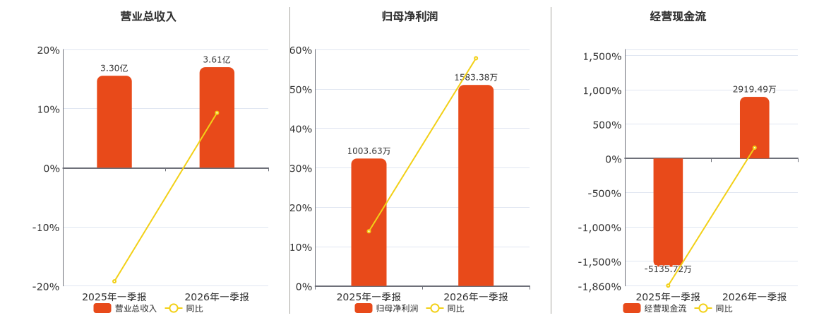 公司营业总收入为3.61亿元。归母净利润为1583.38万元。经营活动现金净流入为2919.49万元。