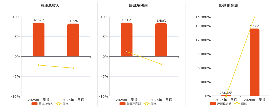 公司营业总收入为31.72亿元,较去年同报告期营业总收入减少9582.12万元,同比较去年同期下降2.93%。归母净利润为1.48亿元,较去年同报告期归母净利润减少292.67万元,同比较去年同期下降1.94%。经营活动现金净流入为4.67亿元,较去年同报告期经营活动现金净流入增加4.64亿元,同比较去年同期上涨1.70万%。