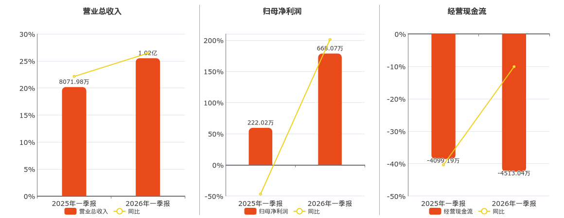 公司营业总收入为1.02亿元。归母净利润为668.07万元。经营活动现金净流入为-4513.04万元,较去年同报告期经营活动现金净流入减少413.84万元。