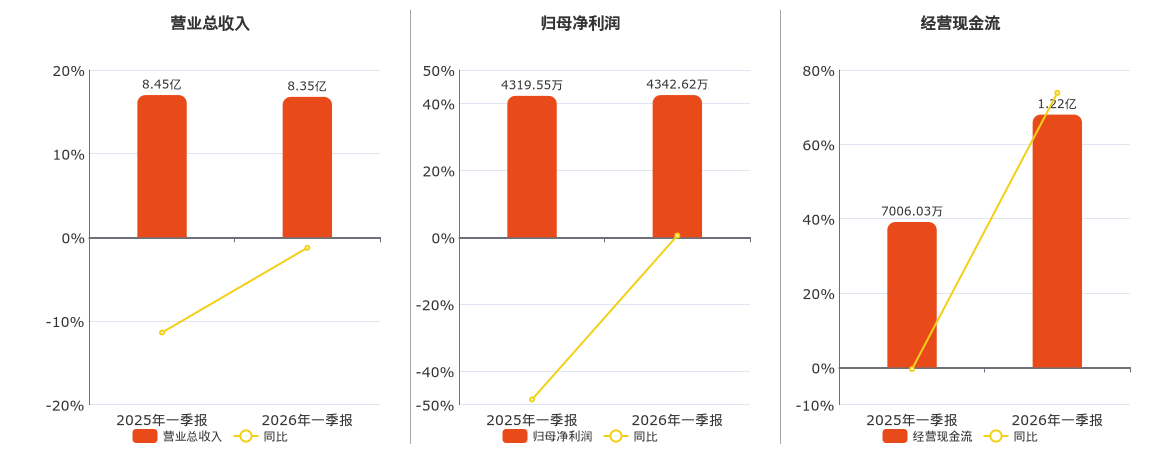 公司营业总收入为8.35亿元,较去年同报告期营业总收入减少1053.37万元,同比较去年同期下降1.25%。归母净利润为4342.62万元。经营活动现金净流入为1.22亿元。