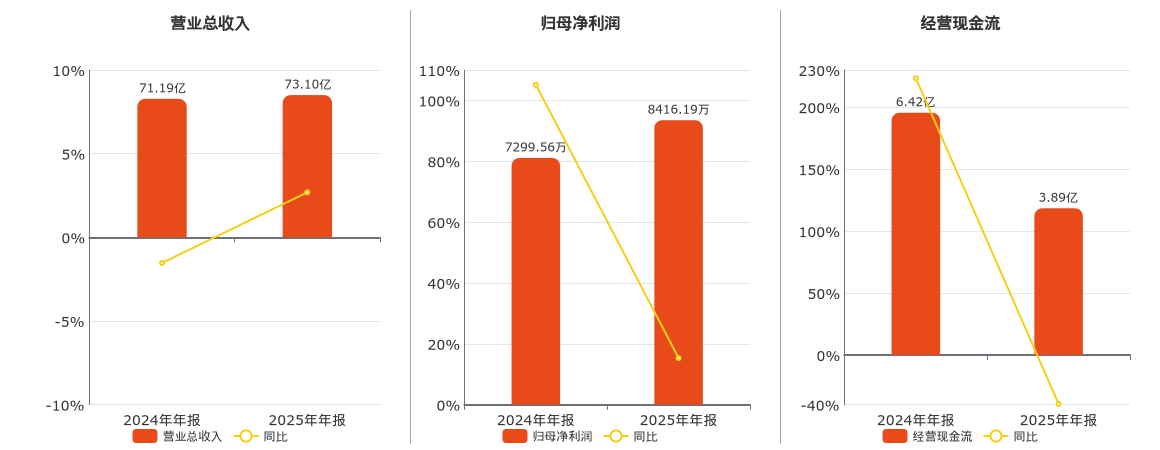 公司营业总收入为73.10亿元,在已披露的同业公司中排名第10,较去年同报告期营业总收入增加1.91亿元,同比较去年同期上涨2.69%。归母净利润为8416.19万元,较去年同报告期归母净利润增加1116.63万元,实现3年连续上涨,同比较去年同期上涨15.30%。经营活动现金净流入为3.89亿元。