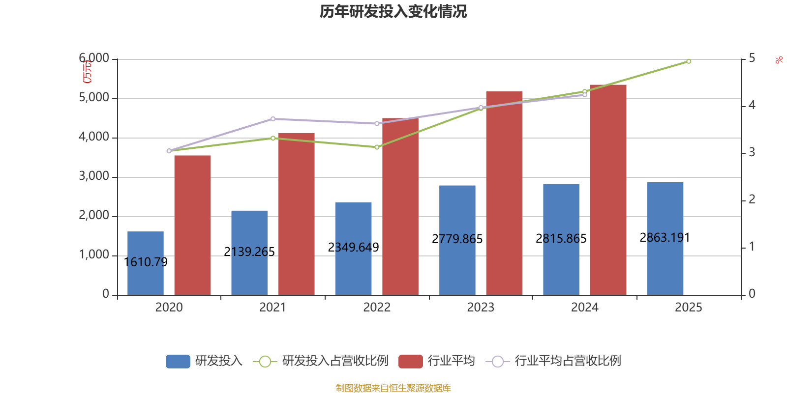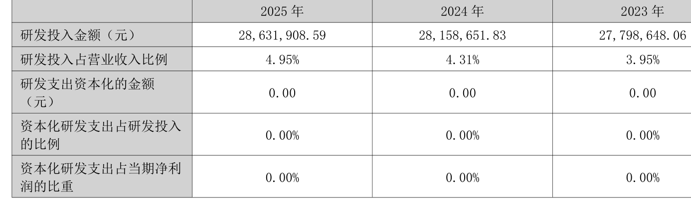 2025年全年,公司研发投入金额为2863.19万元,同比增长1.68%;研发投入占营业收入比例为4.95%,相比上年同期上升0.64个百分点。此外,公司全年研发投入资本化率为0%。