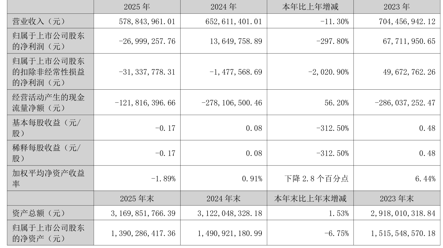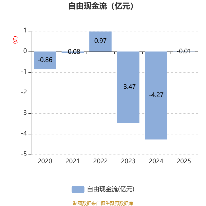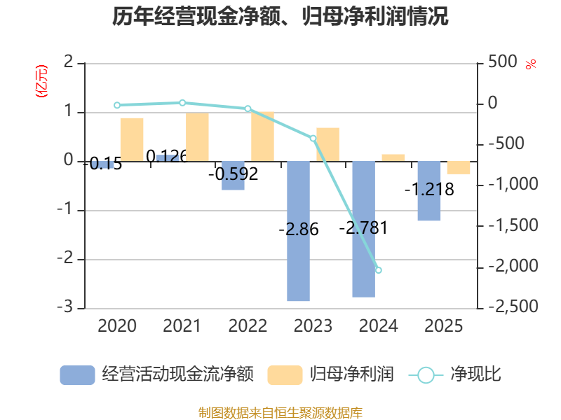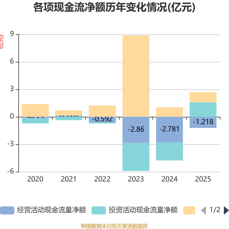截至2025年,公司经营活动现金流净额为-1.22亿元,同比增加1.56亿元;筹资活动现金流净额1.12亿元,同比增加937.14万元;投资活动现金流净额1.58亿元,上年同期为-1.98亿元。