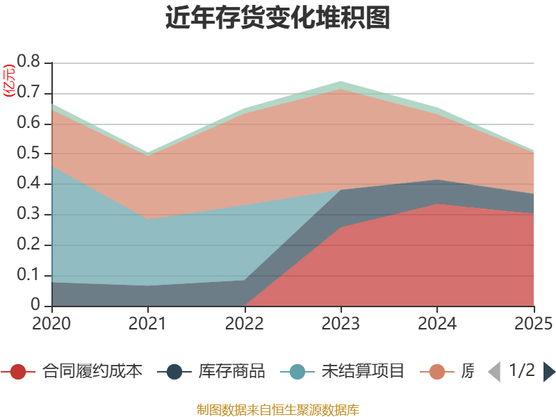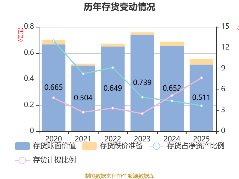从存货变动来看,截至2025年末,公司存货账面价值为5106.86万元,占净资产的3.67%,较上年末减少1415.32万元。其中,存货跌价准备为424.51万元,计提比例为7.67%。