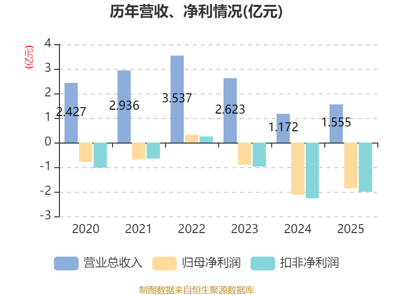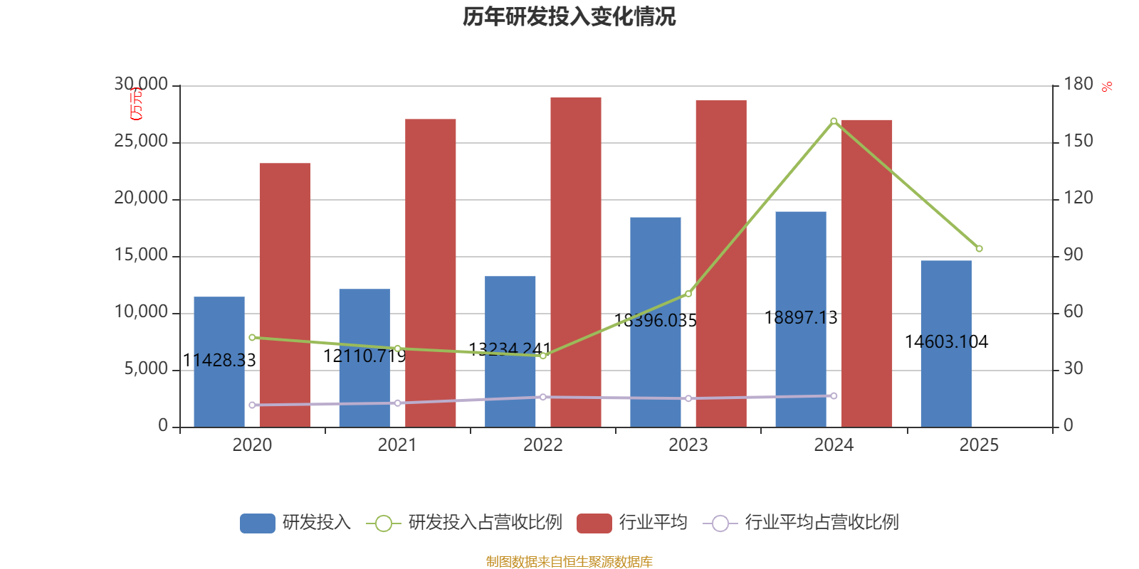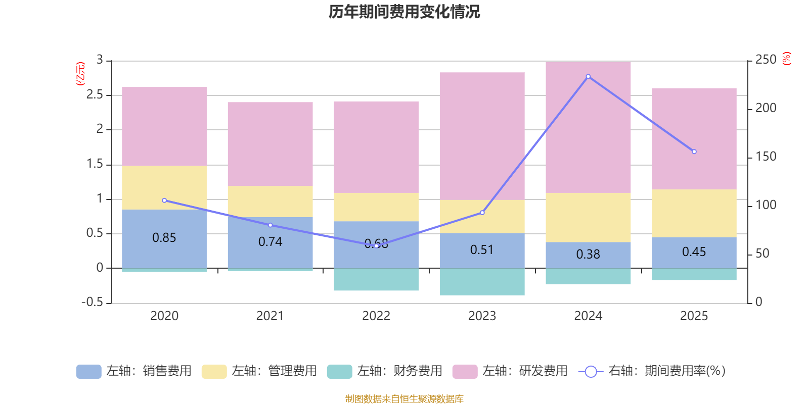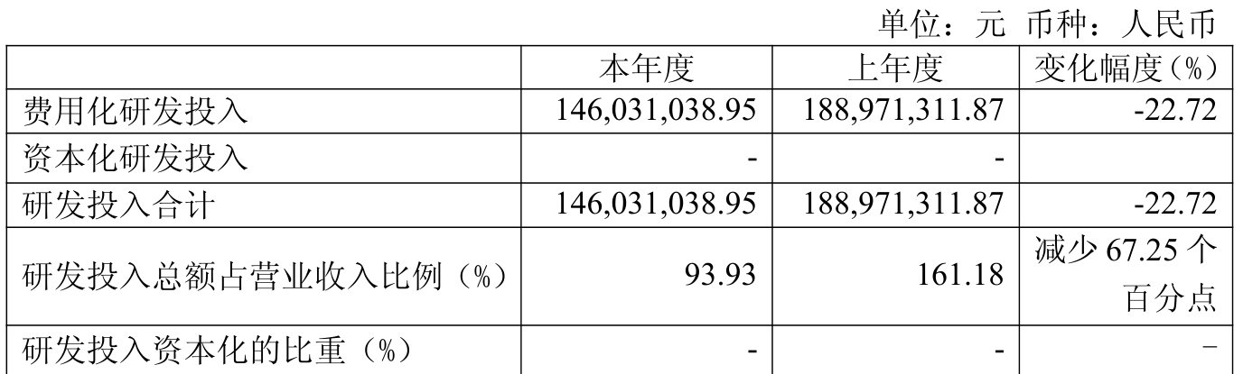 2025年全年,公司研发投入金额为1.46亿元,同比下降22.72%;研发投入占营业收入比例为93.93%,相比上年同期下降67.25个百分点。