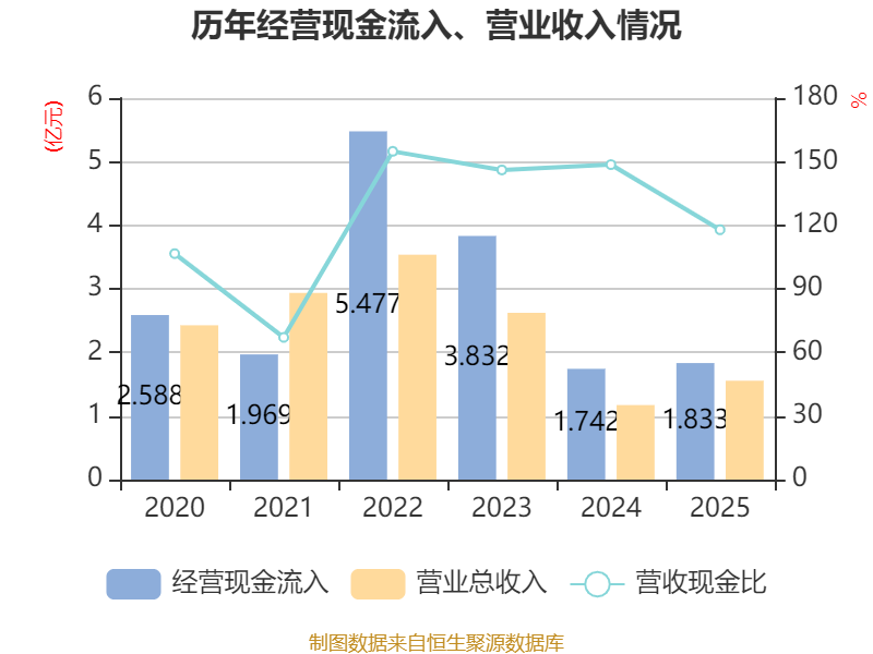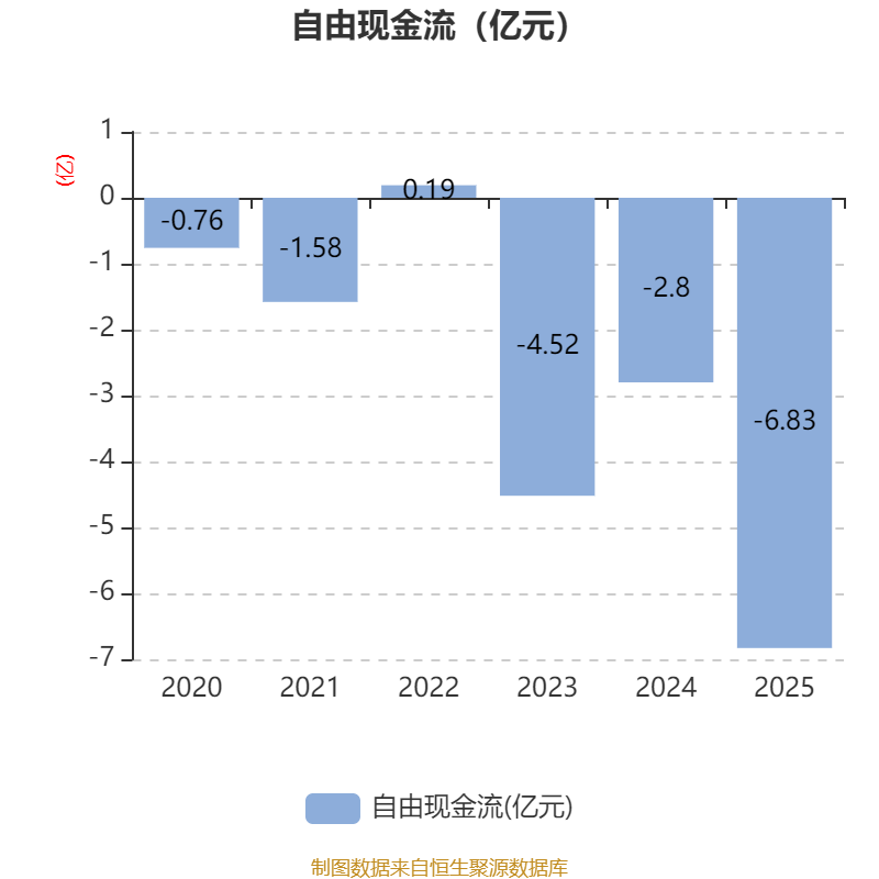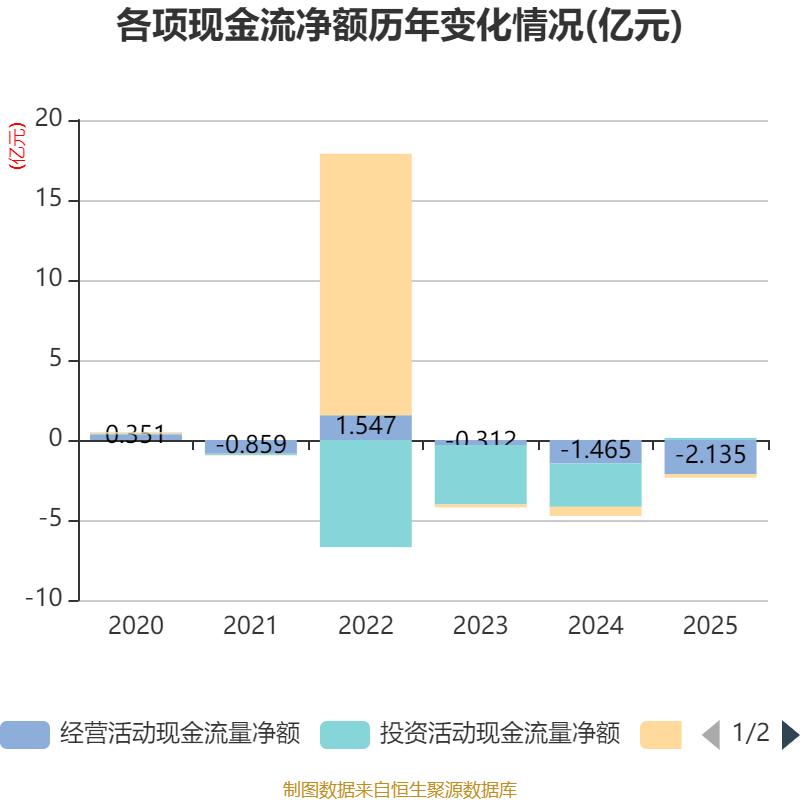 截至2025年,公司经营活动现金流净额为-2.13亿元,同比减少6698.11万元;筹资活动现金流净额-2182.13万元,同比增加3500.32万元;投资活动现金流净额1321.92万元,上年同期为-2.71亿元。