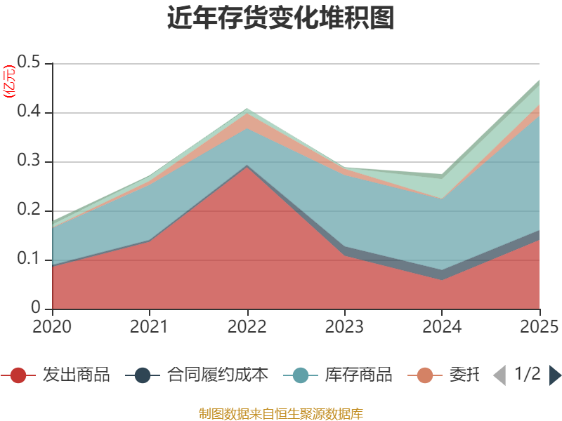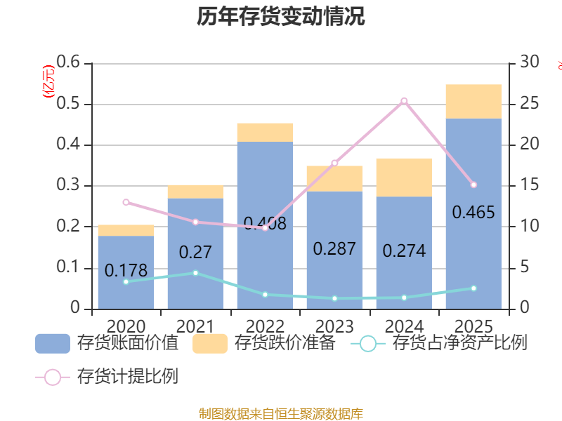 从存货变动来看,截至2025年末,公司存货账面价值为4646.89万元,占净资产的2.5%,较上年末增加1906.71万元。其中,存货跌价准备为828.76万元,计提比例为15.14%。