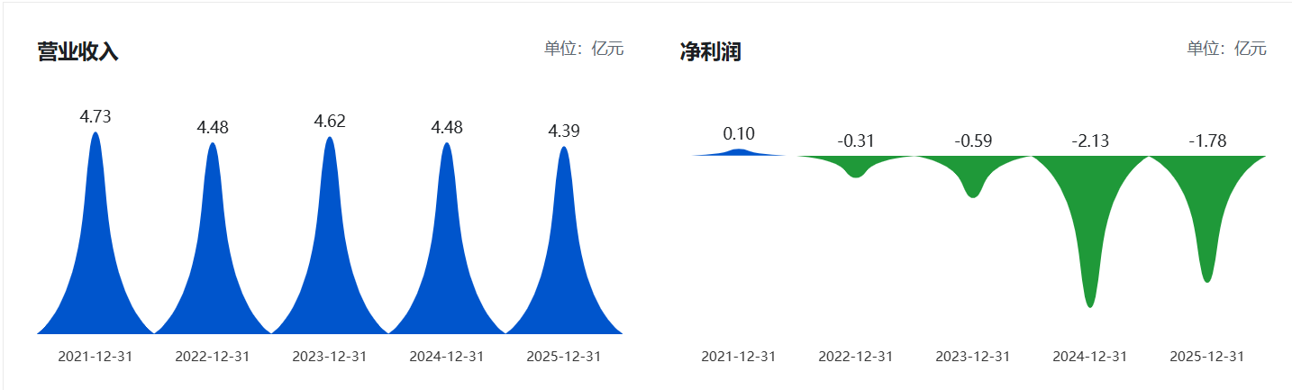 翻阅公司过往年报,公司近五年的营业收入都在4亿多元,相对持平“原地踏步”。自2022年起已连续四年录得年报亏损,四年累计亏损约4.81亿元。