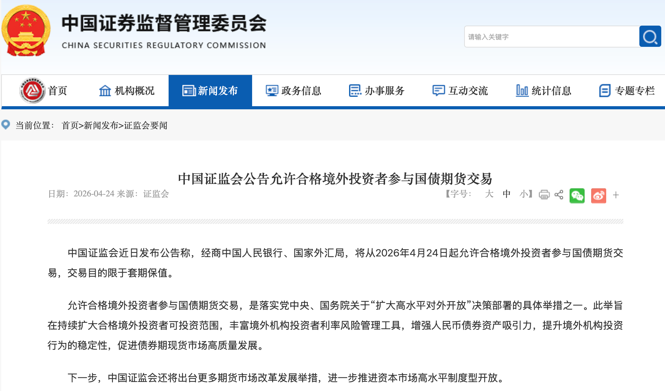 4月24日,中国证监会发布公告称,经商中国人民银行、国家外汇局,将从当日起允许合格境外投资者参与国债期货交易,交易目的限于套期保值。