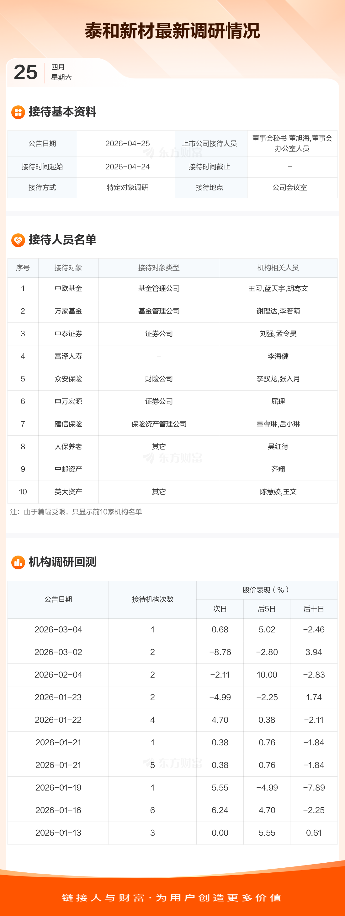 泰和新材4月25日公告称,4月24日接待中欧基金等15家机构调研。接待人员包括董事会秘书 董旭海,董事会办公室人员。