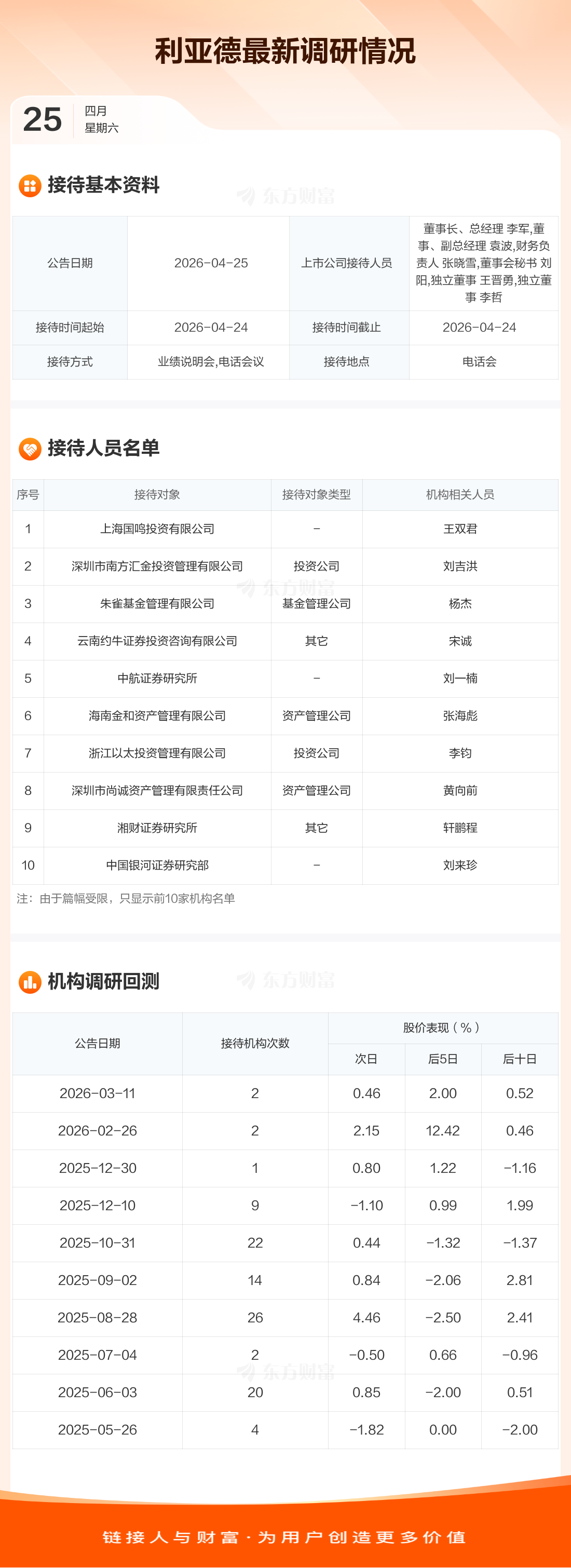 利亚德4月25日公告称,4月24日接待上海国鸣投资有限公司等28家机构调研。接待人员包括董事长、总经理 李军,董事、副总经理 袁波,财务负责人 张晓雪,董事会秘书 刘阳,独立董事 王晋勇,独立董事 李哲。