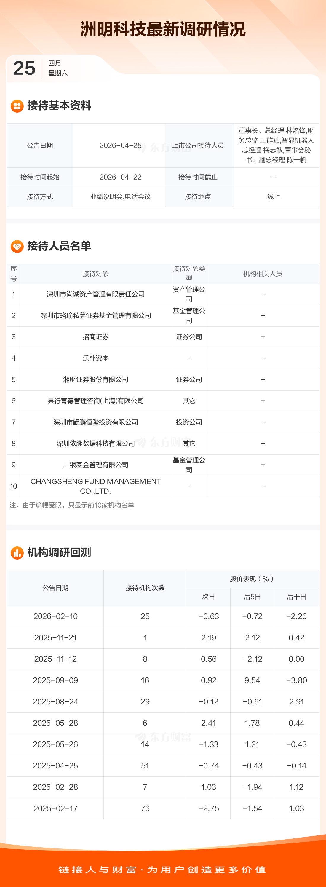 洲明科技4月25日公告称,4月22日接待深圳市尚诚资产管理有限责任公司等20家机构调研。接待人员包括董事长、总经理 林洺锋,财务总监 王群斌,智显机器人总经理 梅志敏,董事会秘书、副总经理 陈一帆。