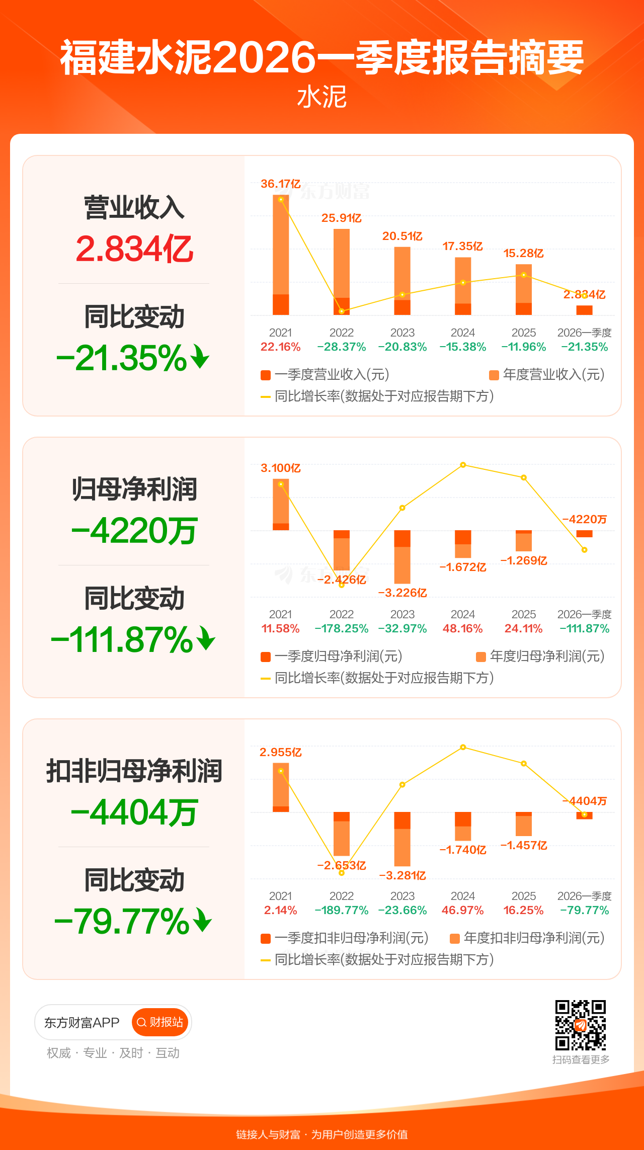 福建水泥4月27日发布2026年一季报显示,公司一季度实现营业收入2.83亿元,同比下滑21.35%;归母净利润-4220.18万元;扣非归母净利润-4404.27万元。