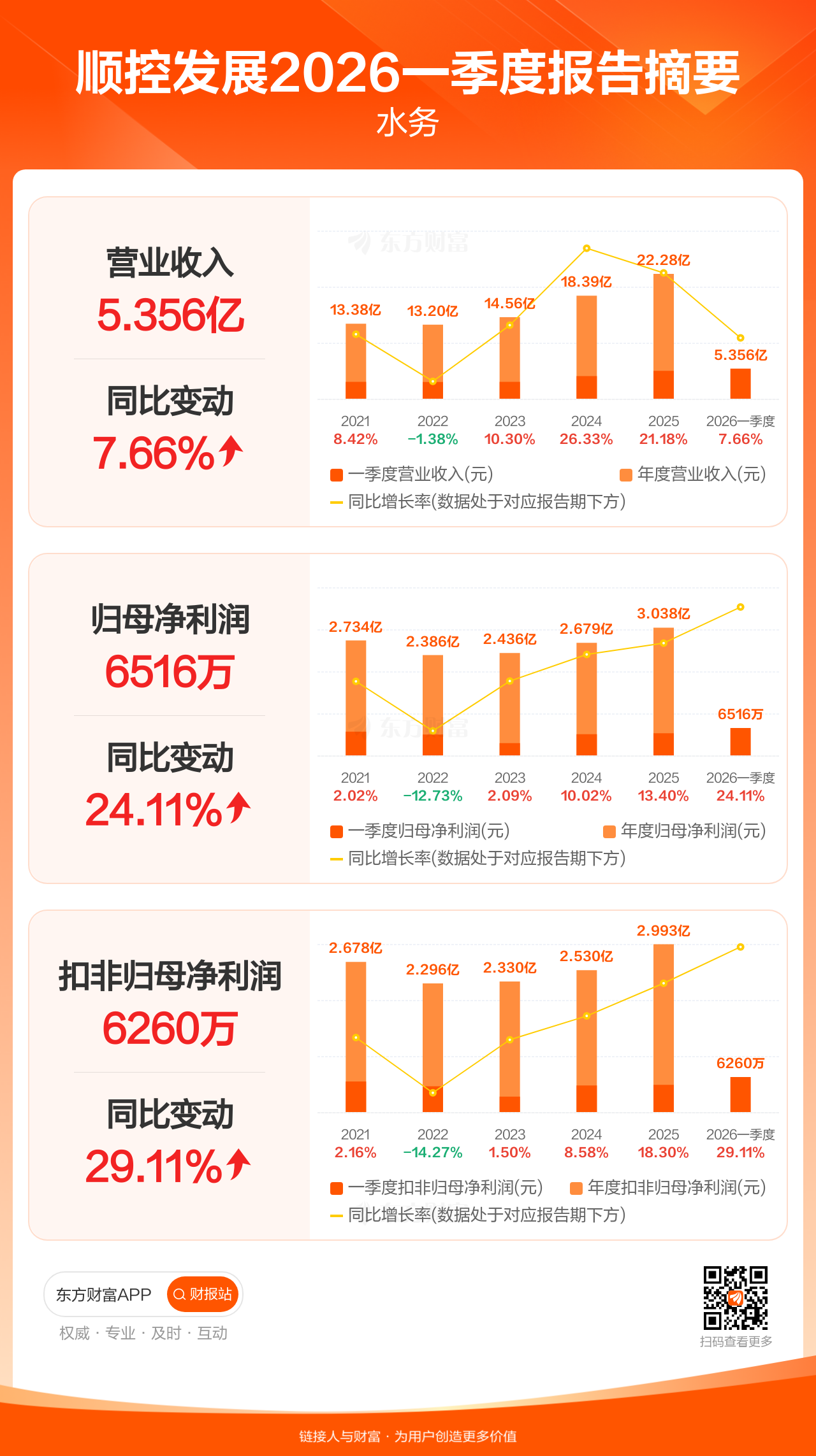 顺控发展4月27日发布2026年一季报显示,公司一季度实现营业收入5.36亿元,同比增长7.66%;归母净利润6516.24万元,同比增长24.11%;扣非归母净利润6259.83万元,同比增长29.11%。